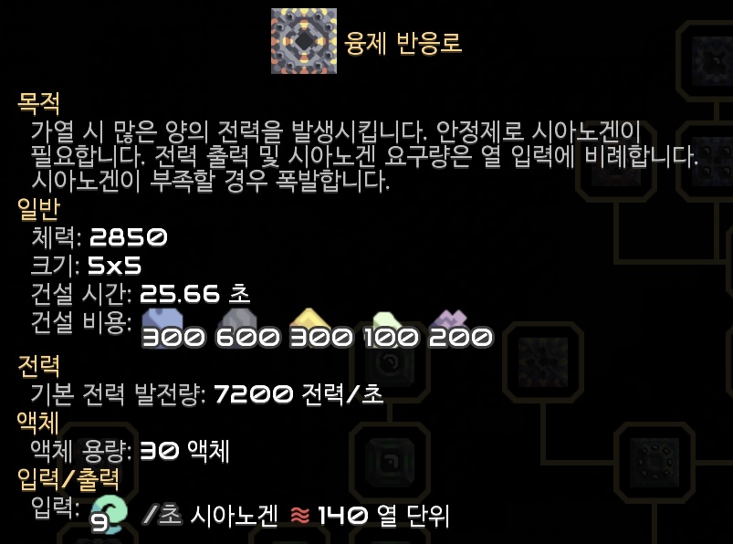 지금까지 연구가 완료된 발전 시설 중 가장 높은 발전량을 자랑하는 열분해 발전기(1,500)에 비해 월등히 높은 발전량(7,200)이지만, 생산하기 까다로운 시아노겐을 필요로 합니다. 게다가 무려 140이나 되는 열이 가동에 필수적이라 실효성이 있을진 의문이 드네요..