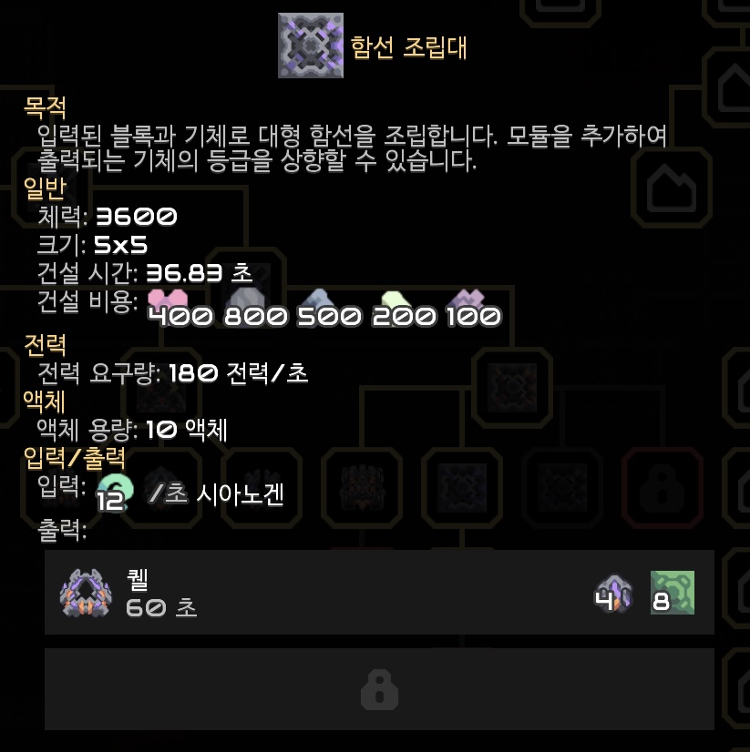 비행 유닛을 생산하는 함선 조립대가 가장 먼저 눈에 띄었어요. 특이하게도 블록과 기체를 입력하여 대형 함선을 조립한다고 하는데, 일루드 네 대와 대형 베릴륨 벽 여덟 개로 퀠을 생산합니다. 함선 조립대의 가동에는 생산하기 번거로운 자원인 시아노겐이 필요하네요.
