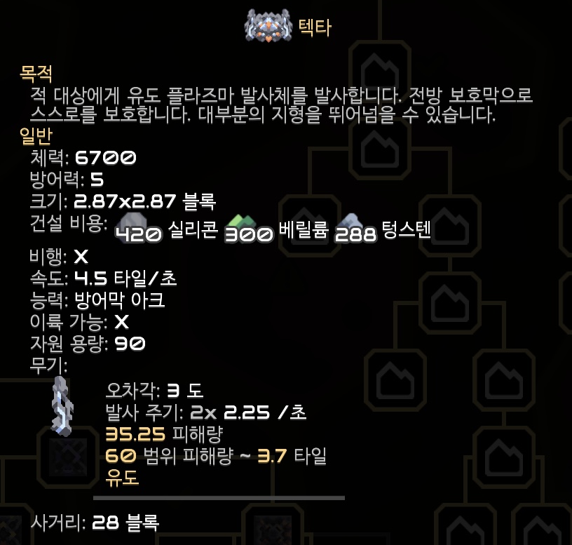 텍타의 스펙입니다. 유도 플라즈마 발사체로 공격하고 전방 보호막으로 스스로를 보호할 수 있다고 합니다. 여느 기계 유닛들과 같이 대부분의 지형을 뛰어넘을 수 있지만 사거리가 너무 짧아 아쉽네요.