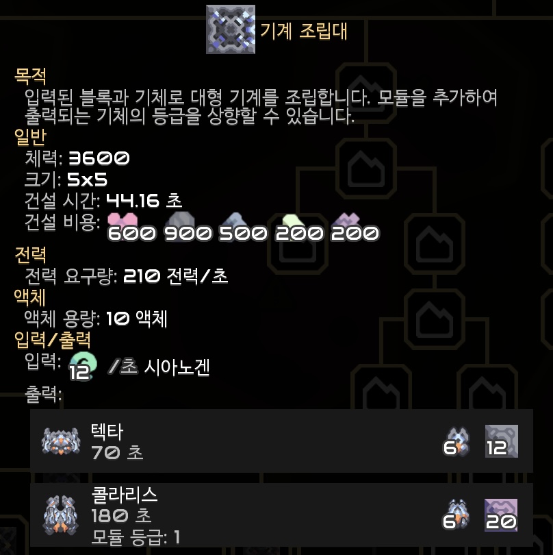함선 조립대와 함께 해금된 기계 조립대입니다. 가동에는 함선 조립대와 같이 고급 자원인 시아노겐이 필요합니다. 기계 유닛인 텍타와 콜라리스를 생산하는데, 콜라리스는 아직 연구가 진행되지 않아도 보이네요. 자잘한 버근가 봅니다!