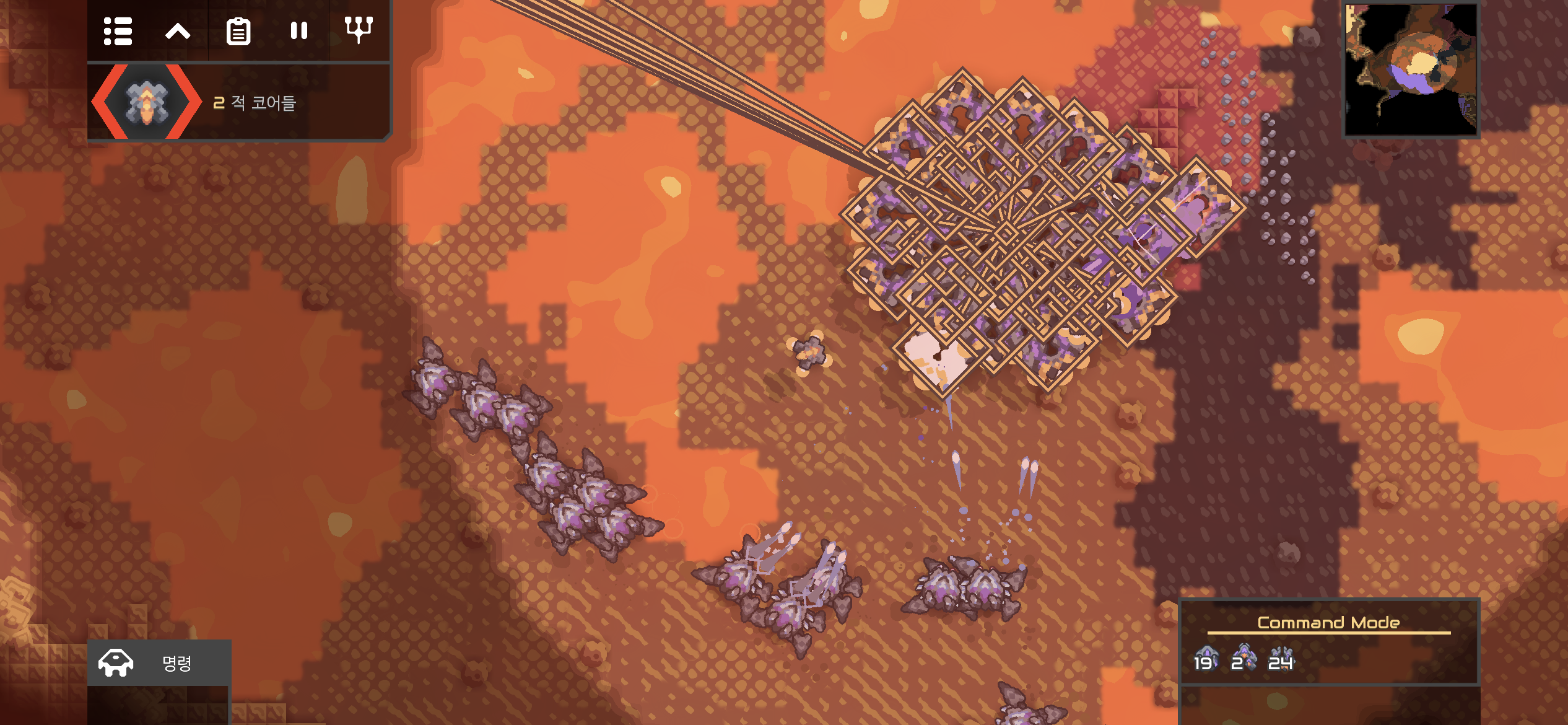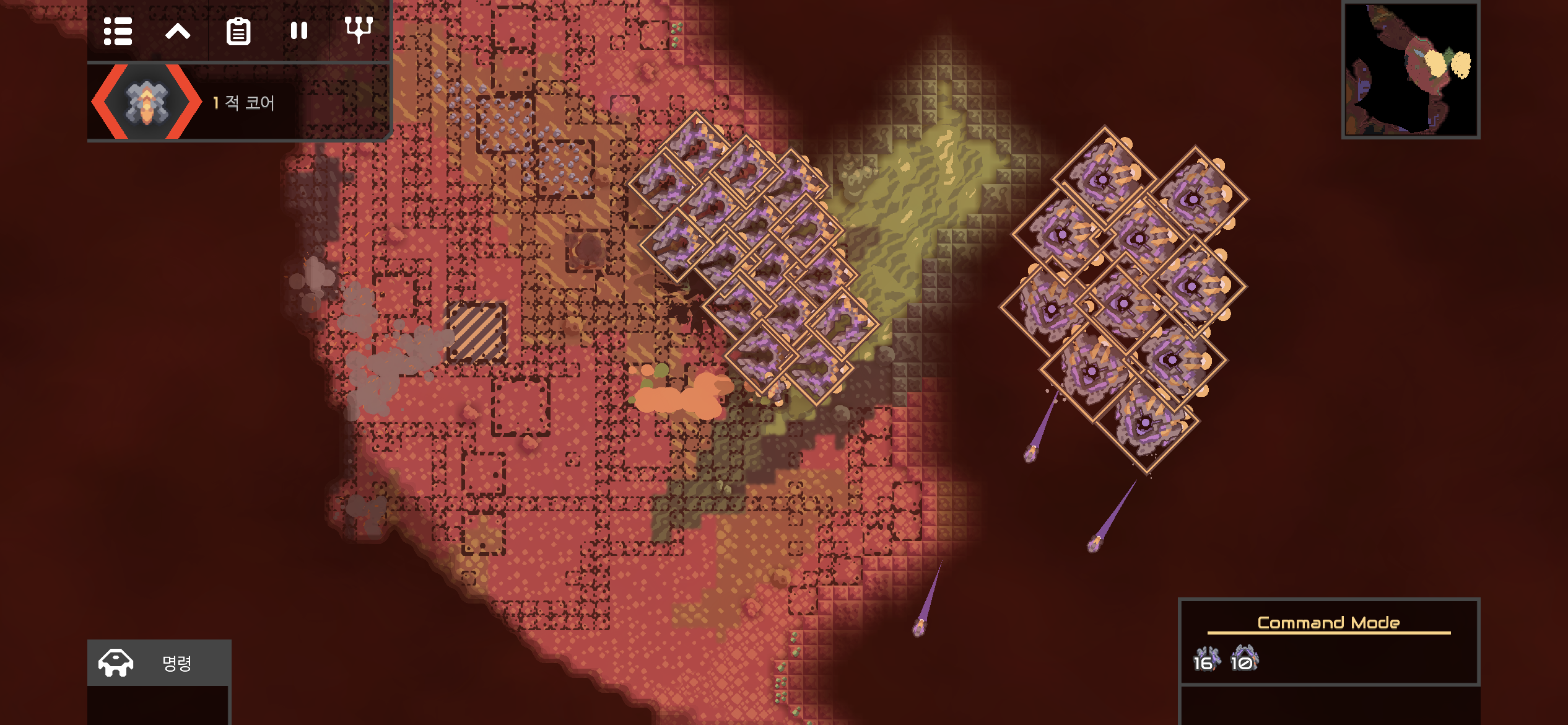 생산해둔 오비에이트로 아군 코어 아래의 첫 번째 적 코어를 파괴합니다. 이 위치의 적 코어 주변은 방어가 허술하여 파괴하기가 쉽습니다. 부담 없이 공격해도 될만한 사이즈예요.