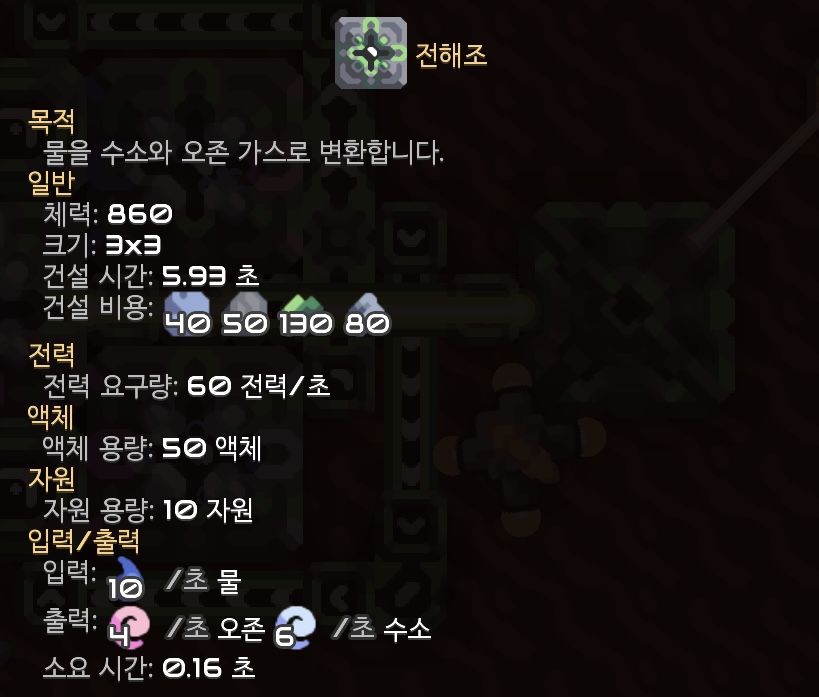 전해조에서 생산되는 수소는 채광•채굴 건물의 필수 또는 선택적 향상에 필요한 자원이며 그 외에도 발전 시설의 가동이나 재생 프로젝터, 유닛 생산의 재료 등에 사용됩니다.