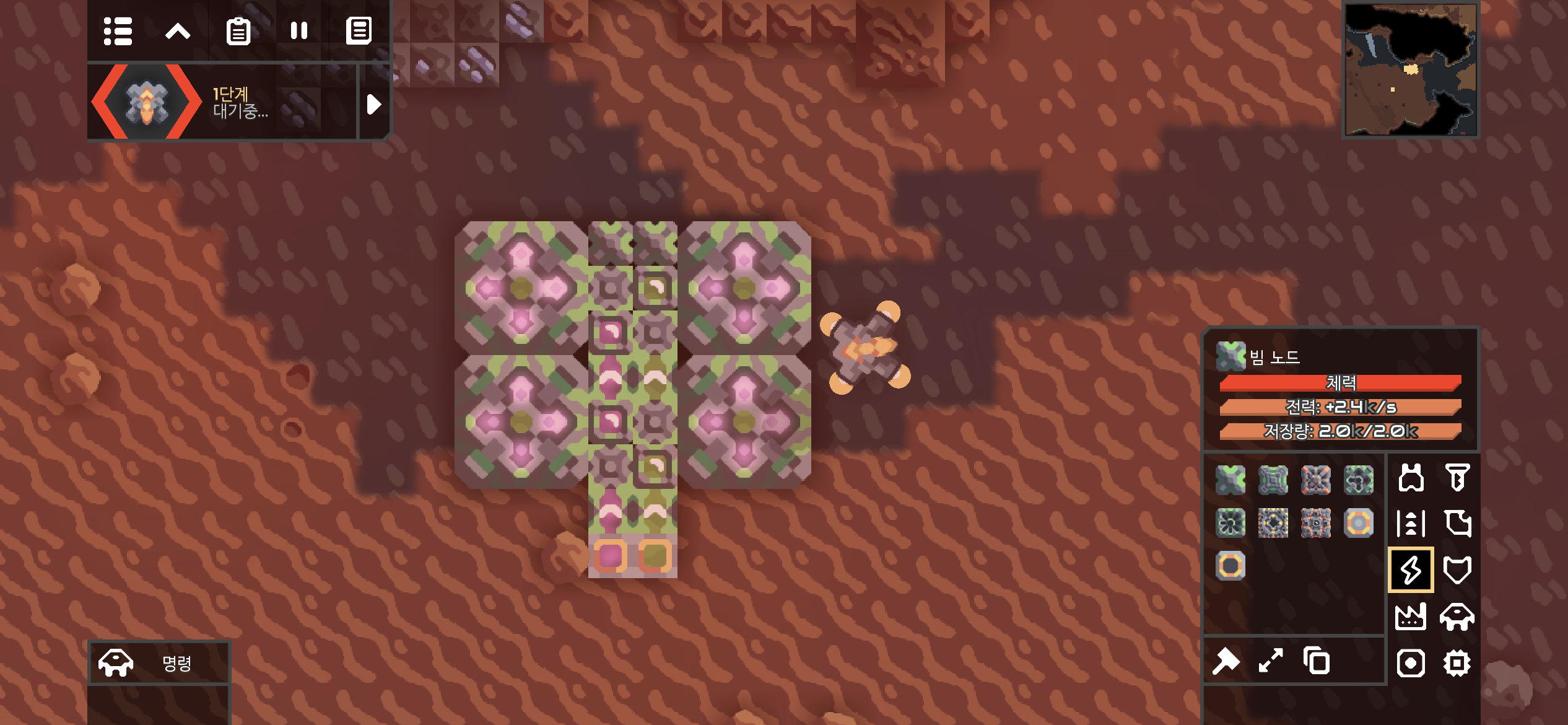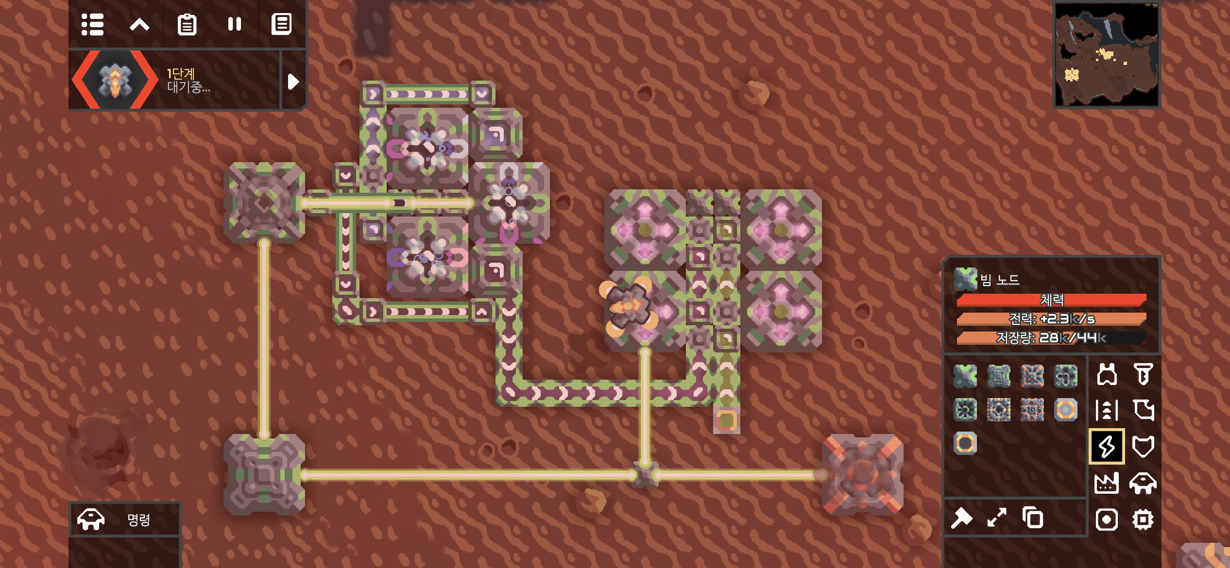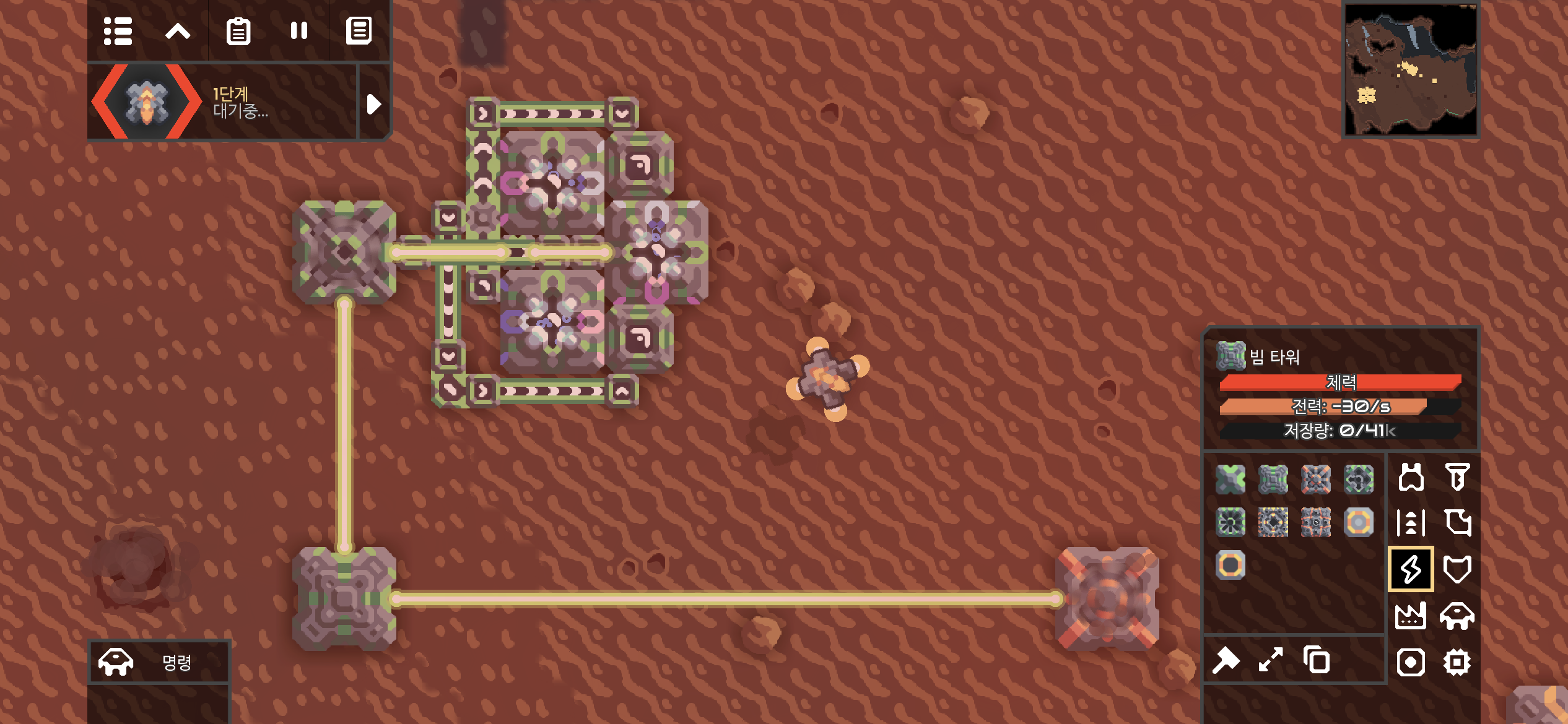 전해조 설계도를 이용해 세 대의 전해조를 건설하면 전력이 부족해 ‘-30/s’의 전력이 됩니다. 이때 공급 전력이 ‘-’가 되더라도 자원 생산 속도의 효율이 떨어질 뿐이지, 시설들의 가동이 완전히 중단되지는 않습니다.