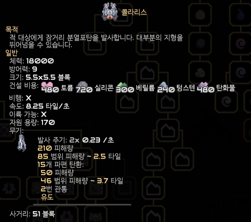 2 티어 기계 조립대에서 생산되는 콜라리스도 막강하네요. 클레로이 6대, 대형 탄화물 벽 20개, 시아노겐 12/s로 생산이 가능합니다.