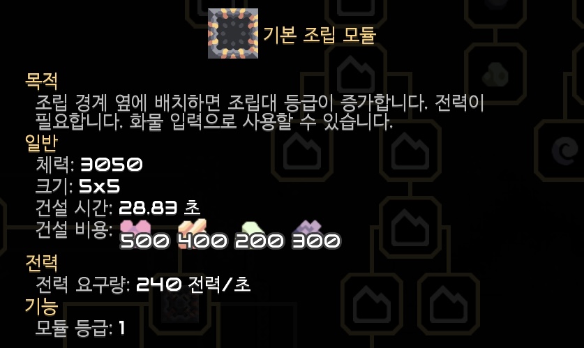 유닛 조립대의 티어를 높이는 기본 조립 모듈입니다. 전차•기계•함선 조립대 모두에 공용으로 사용이 가능하고, 유닛을 조립대가 아닌 기본 조립 모듈에 넣을 수도 있습니다.