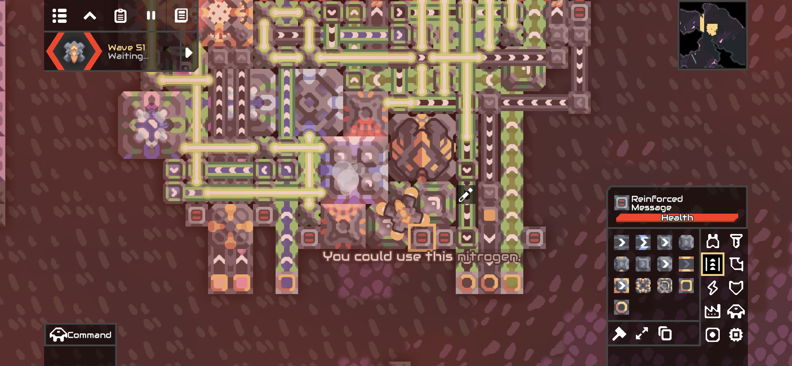 건설 타워의 가동을 위해 생산되는 질소는 보강된 액체 컨테이너에 저장되는데, 보강된 파이프를 연결하여 필요한 곳에 사용할 수 있습니다. 신생물 출력 파이프와 아르키사이트 입력 파이프 사이의 도관에서는 사용 후 남은 메타(0.5/s 정도)가 출력됩니다.