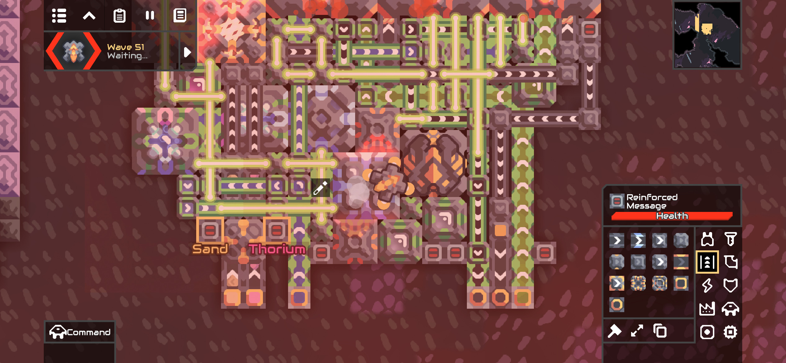 효율 200% 멀라인 설계도에는 사거리가 비교적 짧은 멀라인을 고려해 재생 프로젝터가 포함되어 있고 건물이 파괴될 경우를 대비하여 건설 타워까지 포함되어 있습니다.