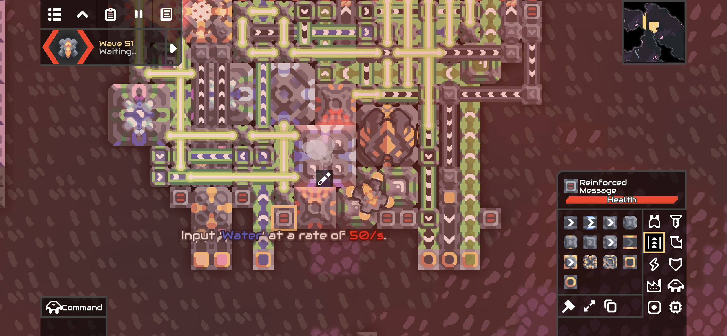 건설에는 메타와 탄화물이 필요하고, 가동에 필요한 전력이 600/s나 필요합니다. 다른 무엇보다 가동이 필요한 열이 무려 90으로 어마어마한데, 터렛의 최대 효율인 200%를 만족하려면 무려 180의 열이 필요합니다..