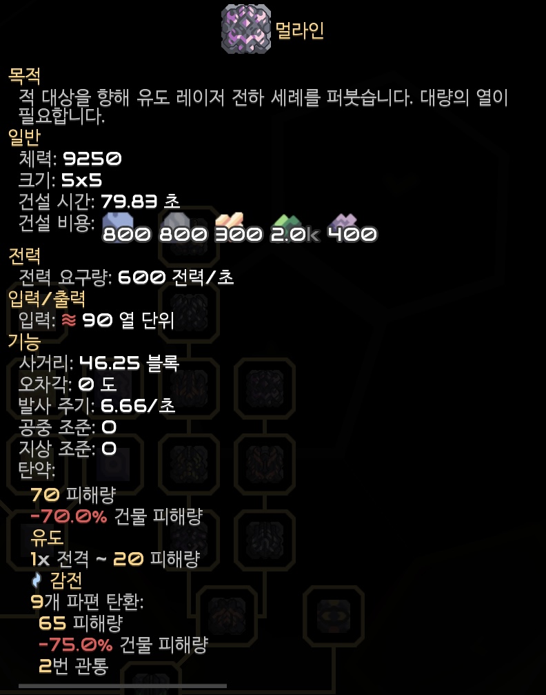 최종 테크의 터렛인 만큼 멀라인은 화려하면서도 강력합니다. 대신 그만큼 사용 조건이 까다로운데요,