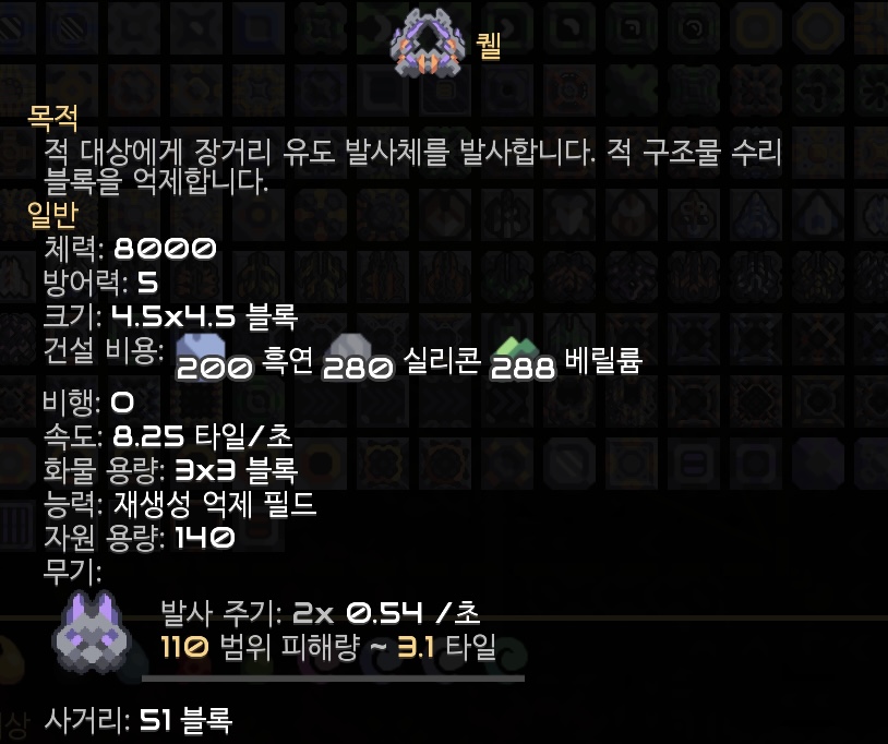 퀠의 사거리는 51블록으로 4 티어 유닛들 중 사거리가 가장 깁니다. 게다가 함선 유닛이라는 점! 유틸리티가 아주 뛰어난 유닛입니다.