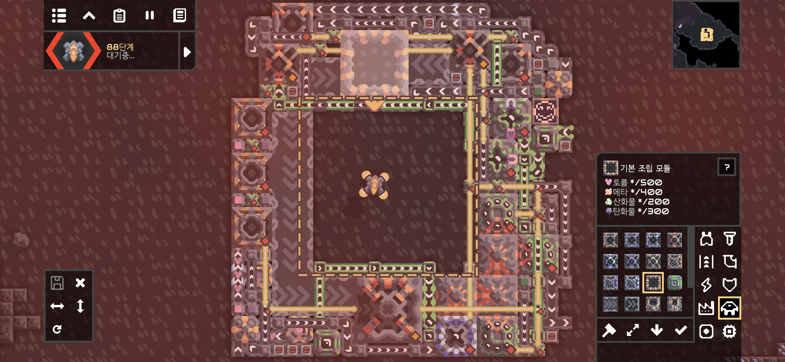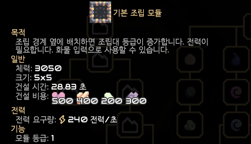 기본 조립 모듈의 건설 재료로 고급 자원인 메타가 필요하고, 가동에는 별도의 전력이 요구됩니다.