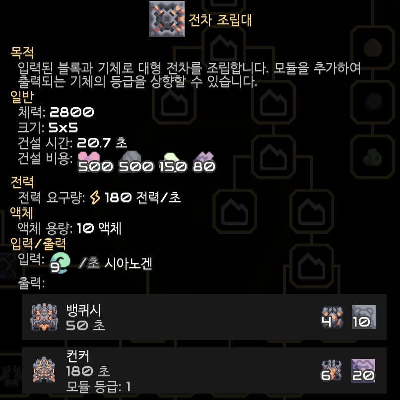 전차 조립대의 가동을 위해 전력과 시아노겐(9/s)이 필요합니다.