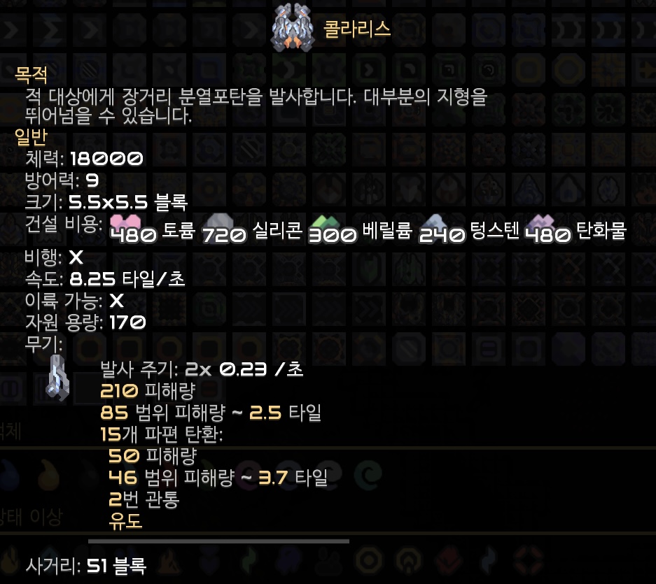 5 티어 기계 유닛 콜라리스는 4 티어 비행 유닛 퀠과 동일한 51의 사거리로, 에르키아 행성의 모든 터렛들보다 사거리가 길어(스캐드 제외) 일단 사거리부터가 제법 쓸만합니다.