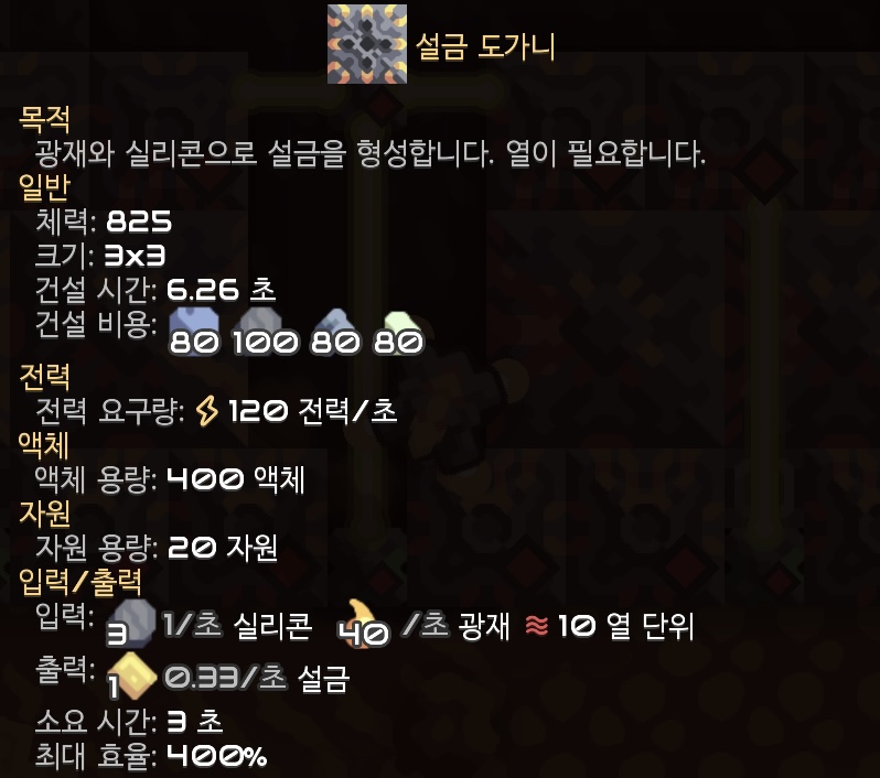 설금 도가니와 탄화물 도가니는 각각 필요한 생산 재료는 다르지만 가동에 필요한 10 열 단위와 최대 효율 400%가 같습니다.