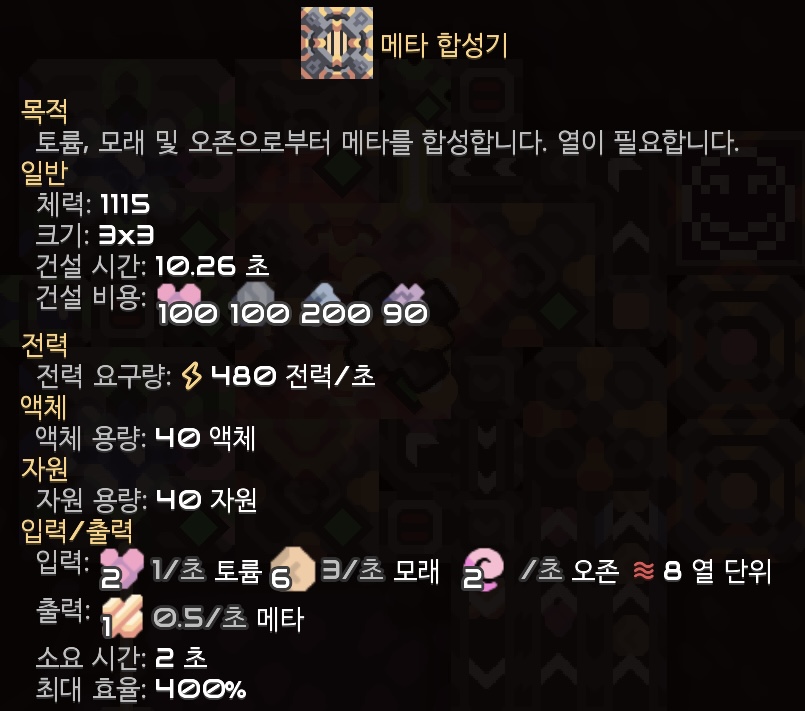 메타 합성기는 토륨과 모래, 오존을 사용해 메타를 생산하고 8 열 단위가 필요합니다.