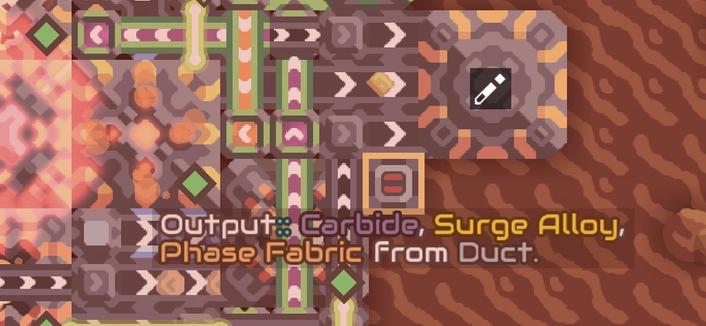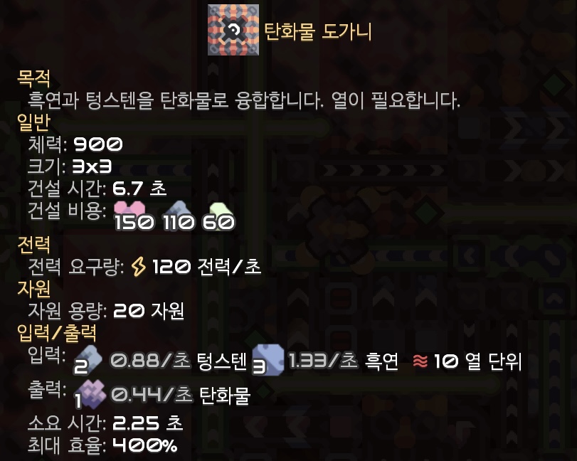 모든 자원이 올바르게 공급된다면 도관 세 줄에서 설금과 탄화물, 메타가 출력됩니다.