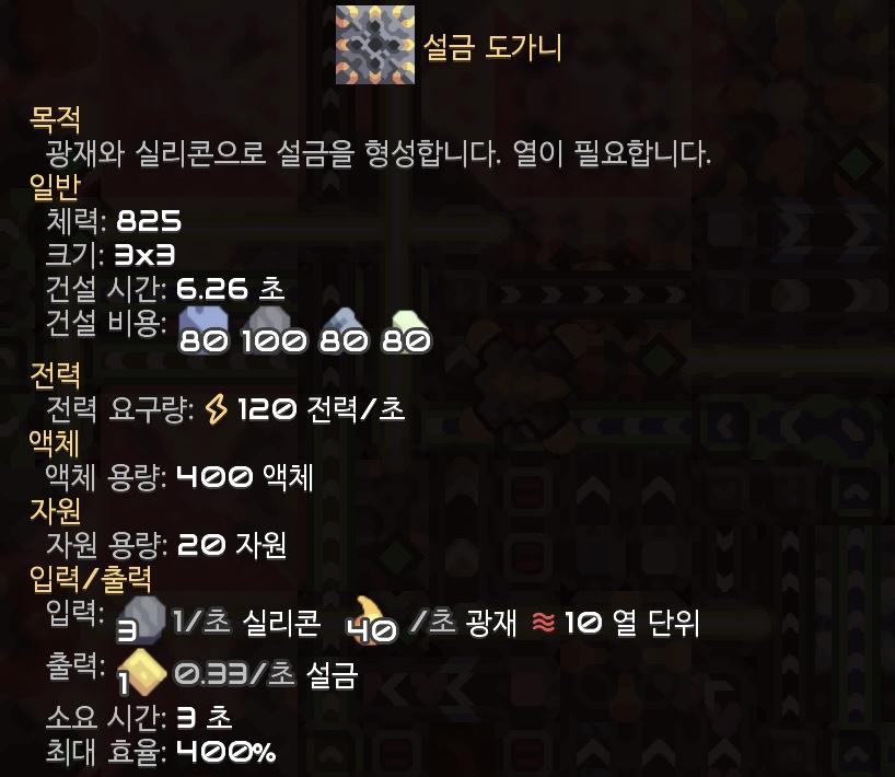 최대 효율 400%를 위해선 설금 도가니와 동일한 수치인 40의 열이 필요합니다.