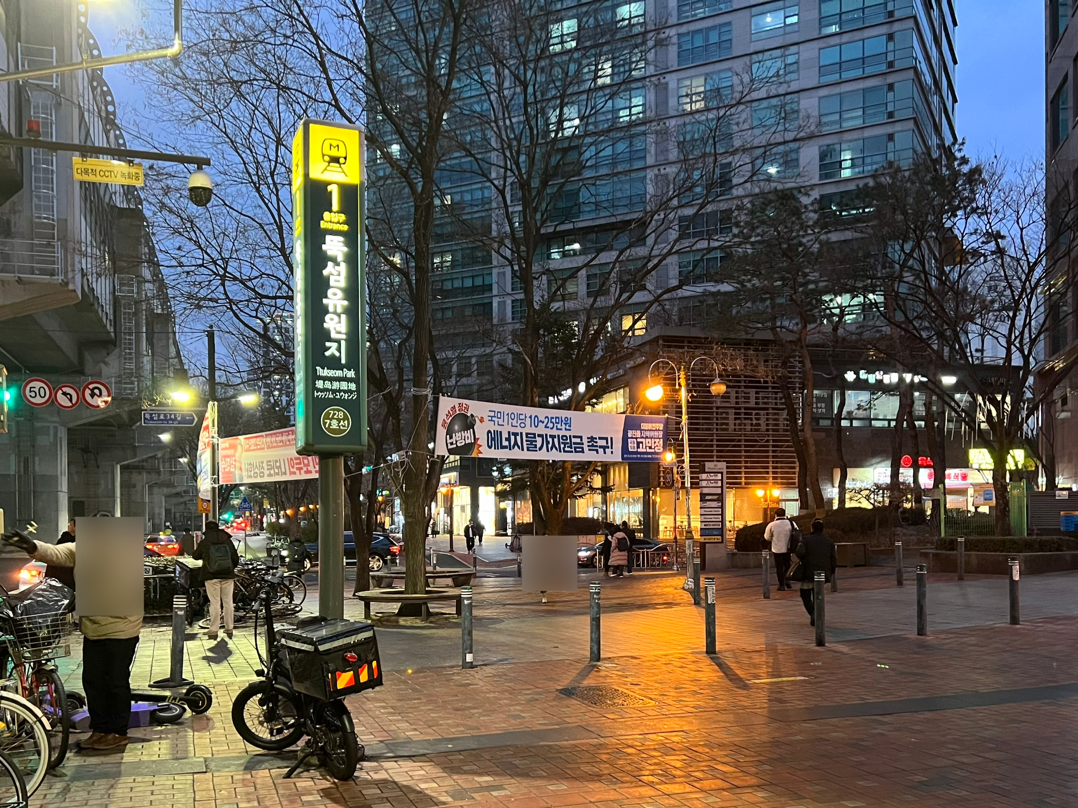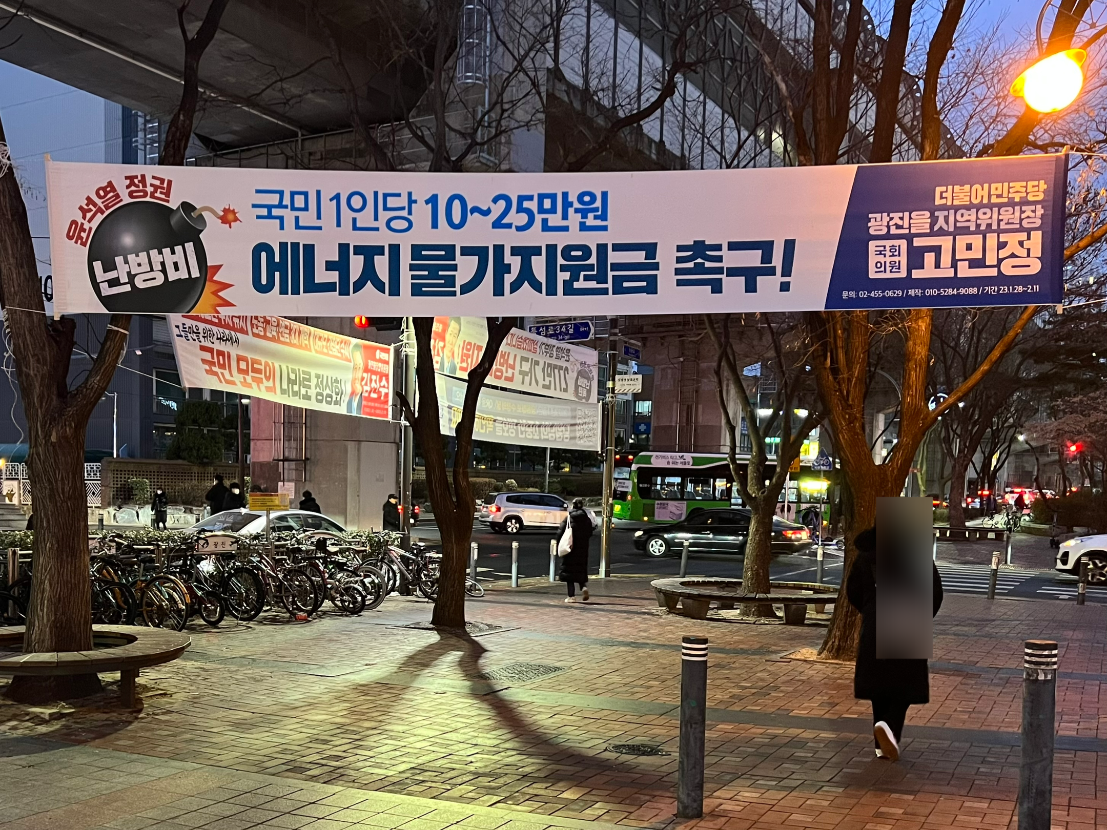 더불어민주당 광진을 지역위원장 고민정 국회의원의 1월 네 번째 현수막이 뚝섬유원지역 1번 출구 앞에 게시되었습니다.