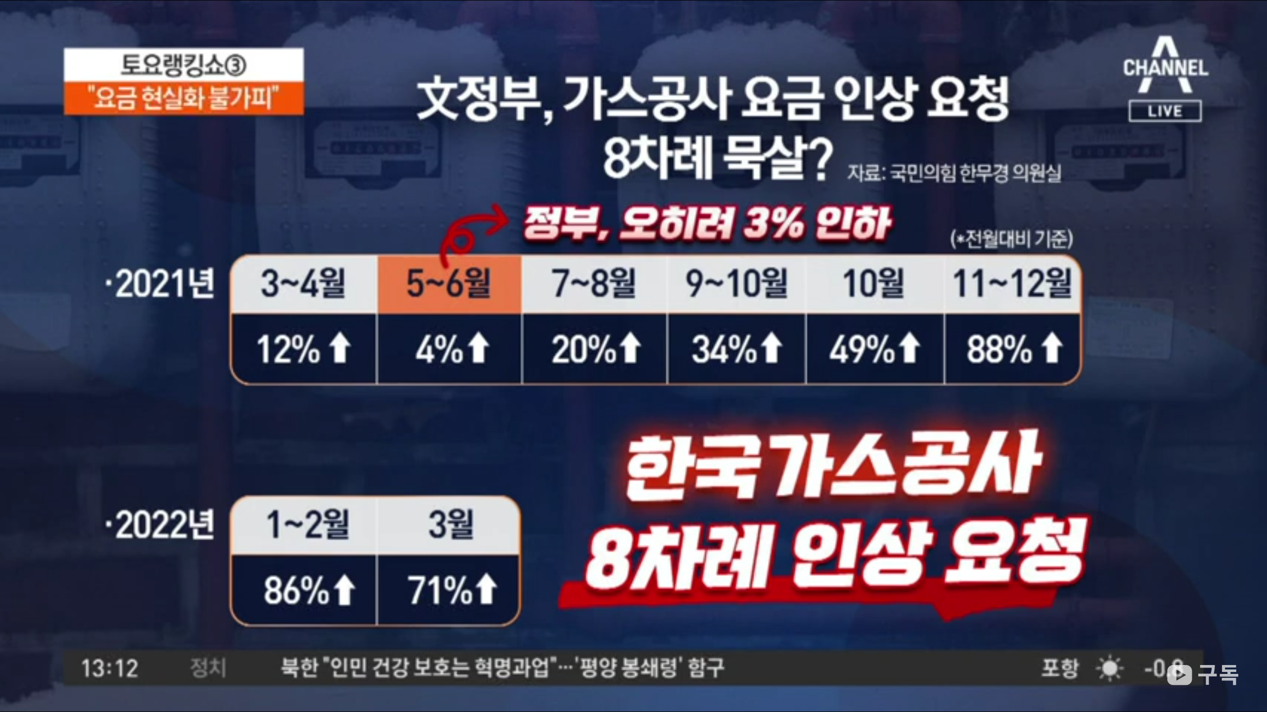 러우 전쟁이 일어나기 전인 2021년부터 가스 공사는 8차례에 걸쳐 요금 인상을 요청했었지만 모두 ‘가스 요금 동결’로 묵살되었고, 정부는 가정용 가스 요금을 오히려 인하했습니다.