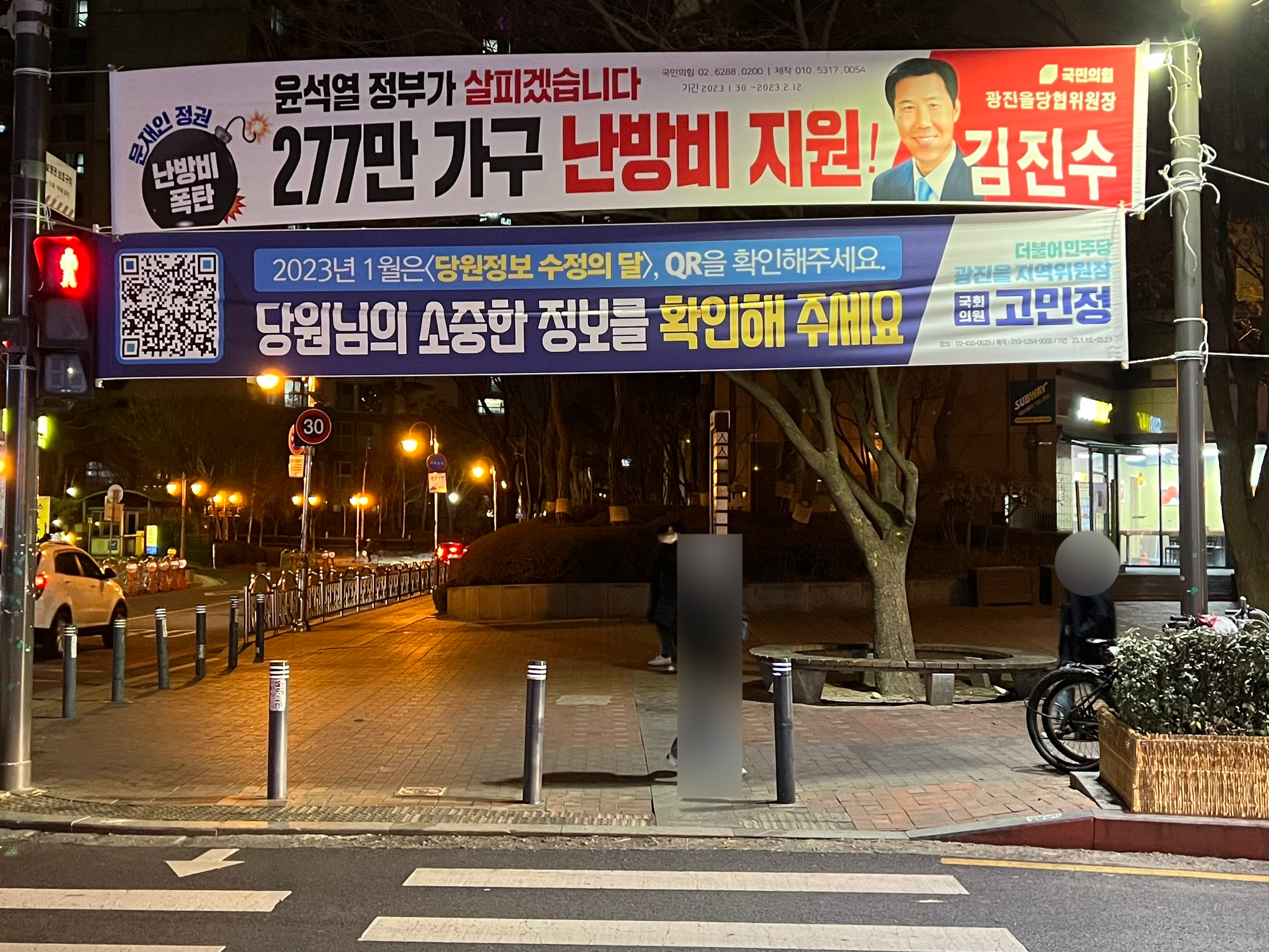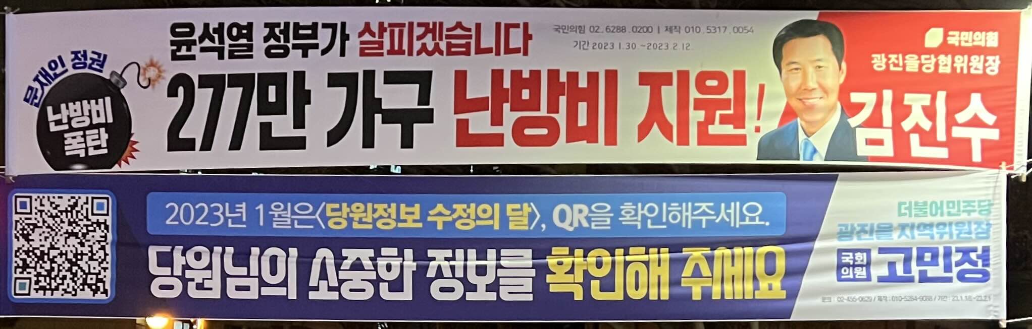 “문재인 정권, 난방비 폭탄! 윤석열 정부, 난방비 지원!”을 외치는 국민의힘 광진을당협위원장 김진수 의원의 현수막과 함께 나란히 걸려있습니다.