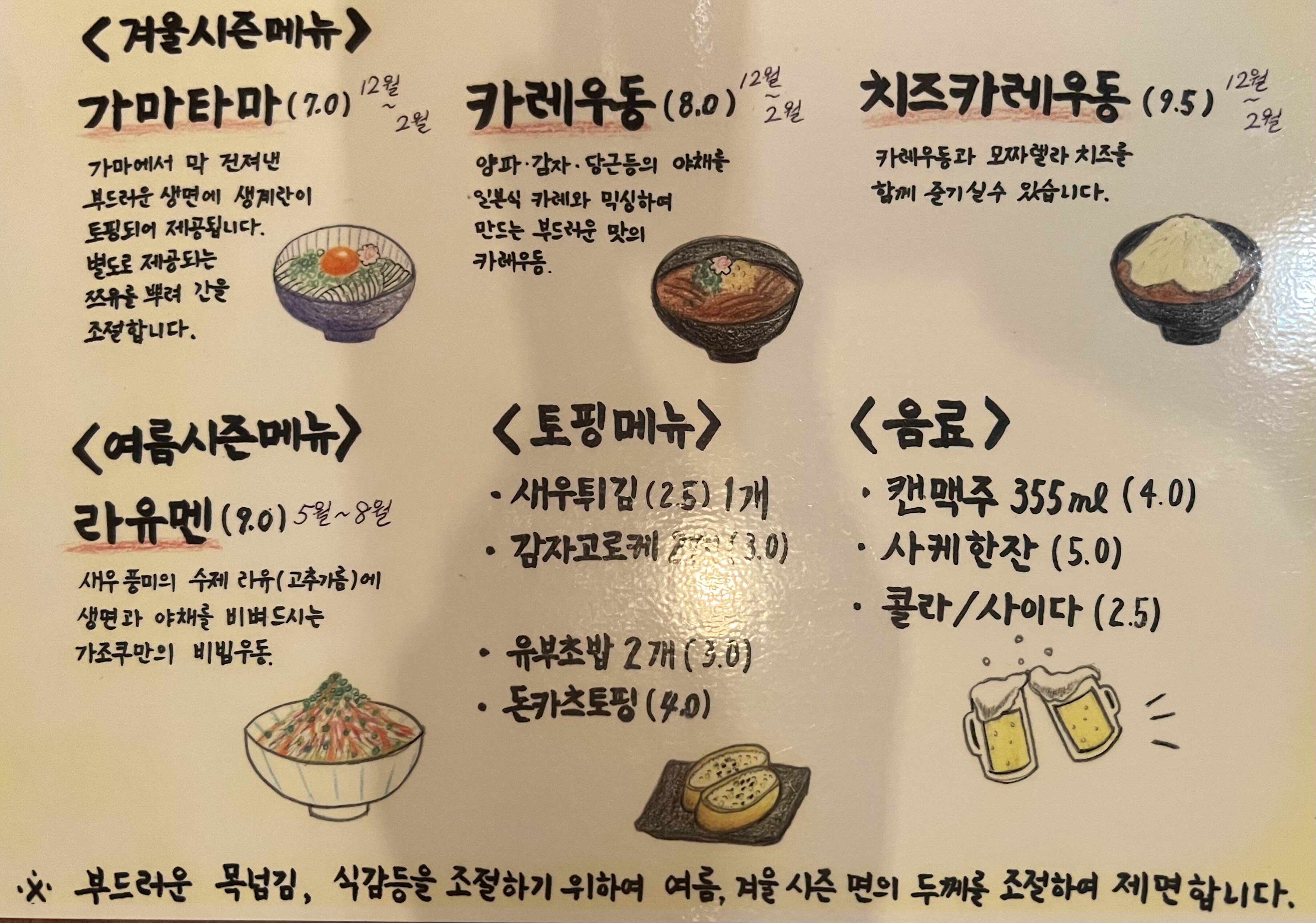 라멘, 소바, 우동 등 다양한 면 요리가 있으며, 쫄깃한 면발로 우동이 아주아주 유명한 곳!