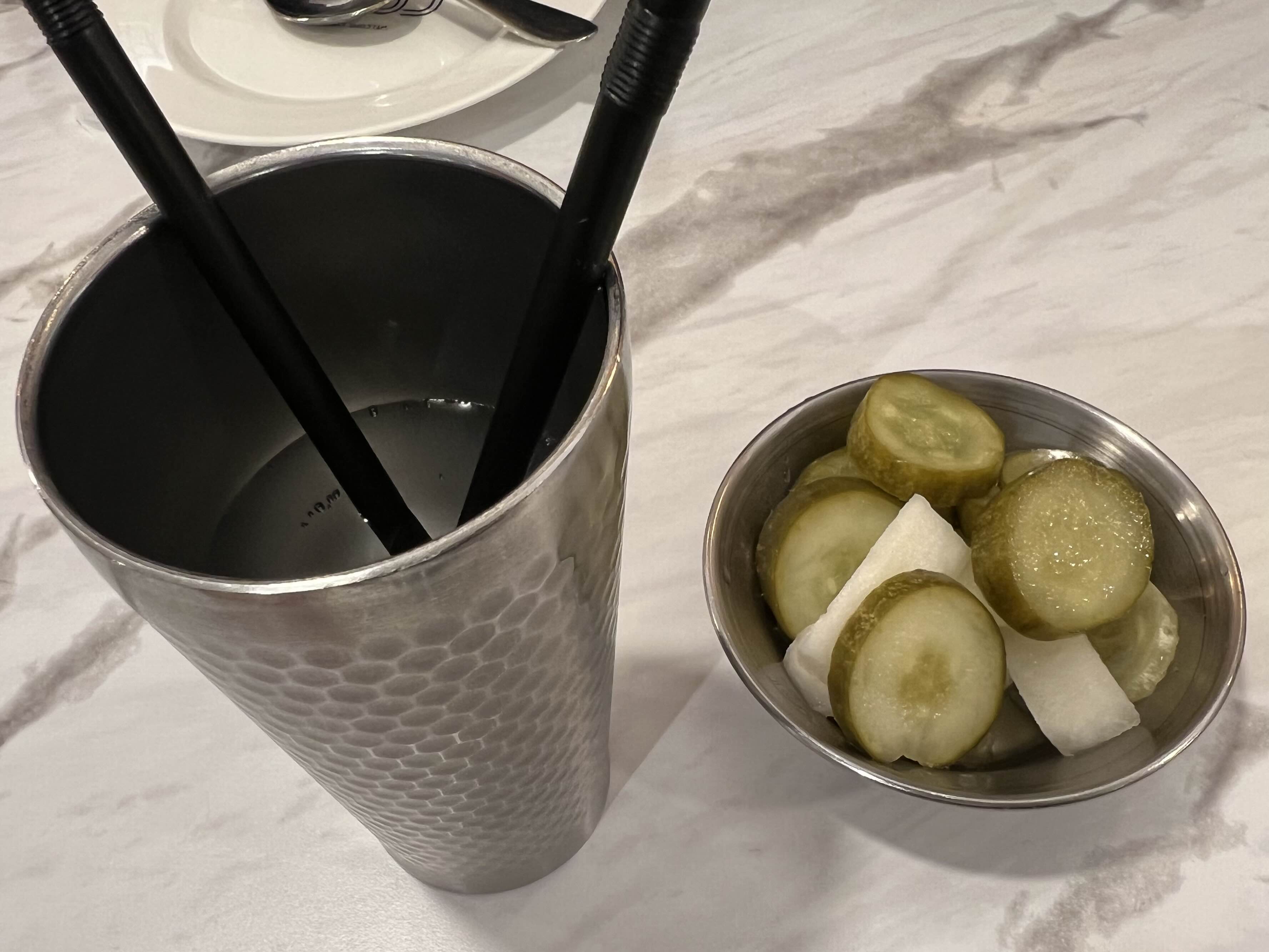 셀프인 물과 피클을 가져오며 조금 더 기다립니다.