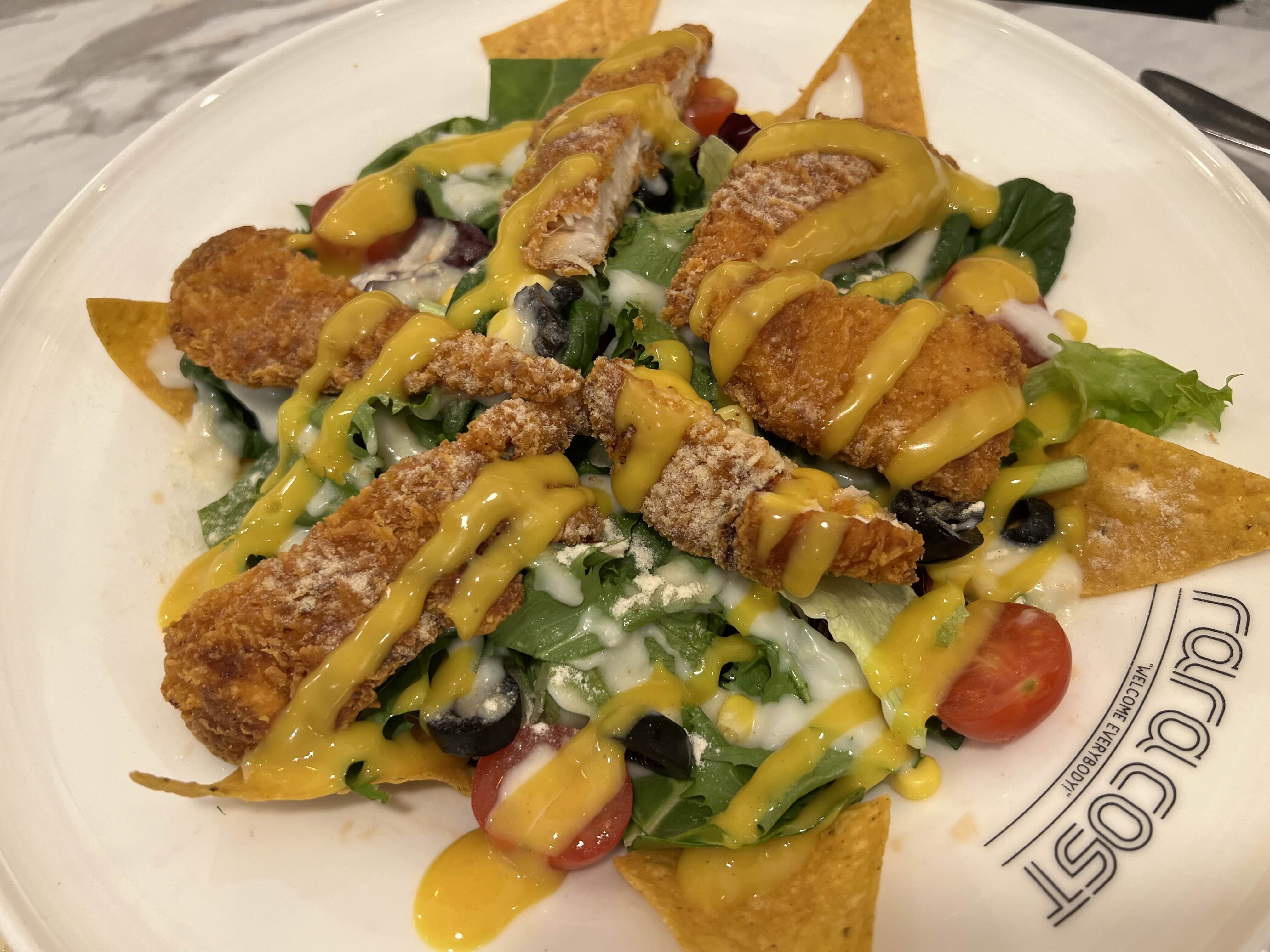 치킨텐더 샐러드는 파스타와 함께 등장했습니다.