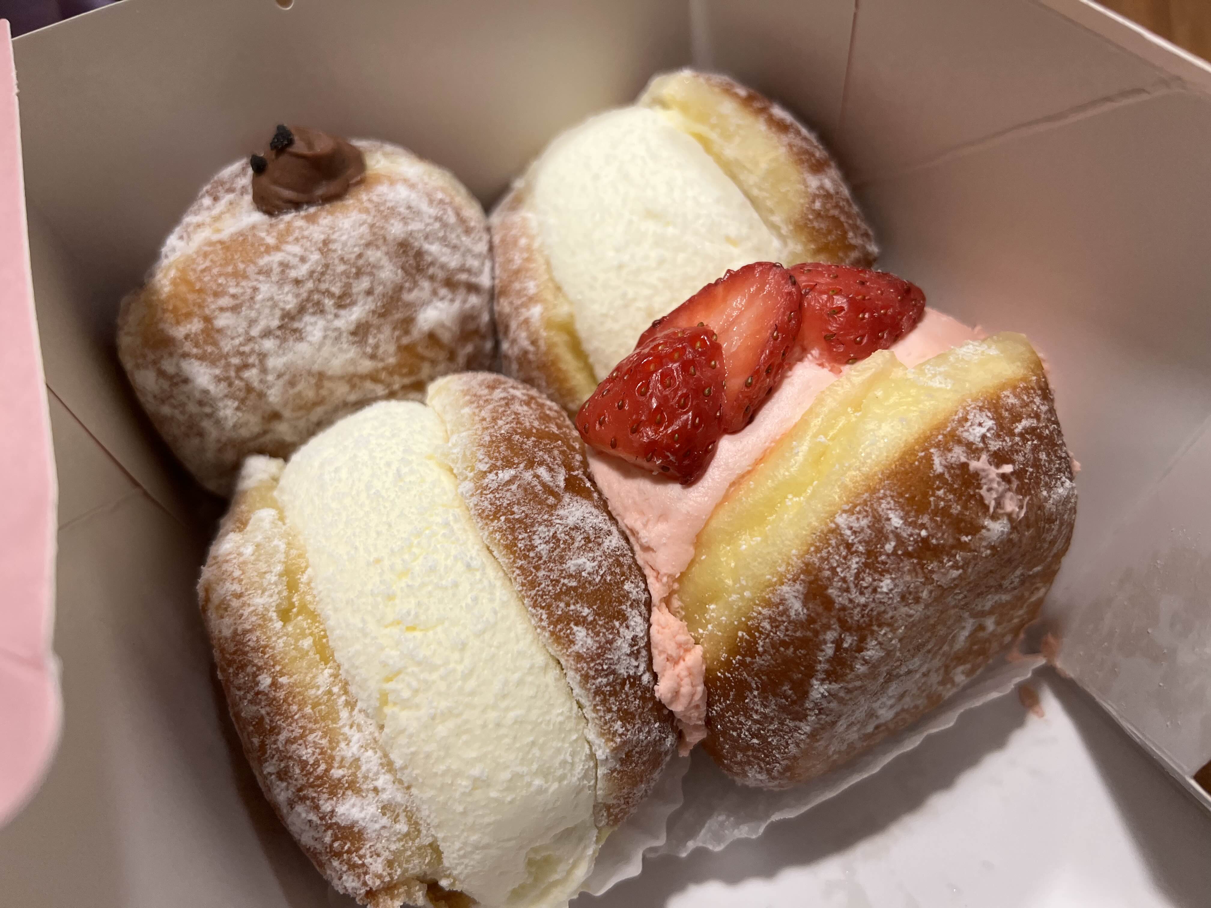 도넛은 쫀쫀하고 부드러운 식감과 적당히 달달하고 상큼한 크림이 특징입니다.
