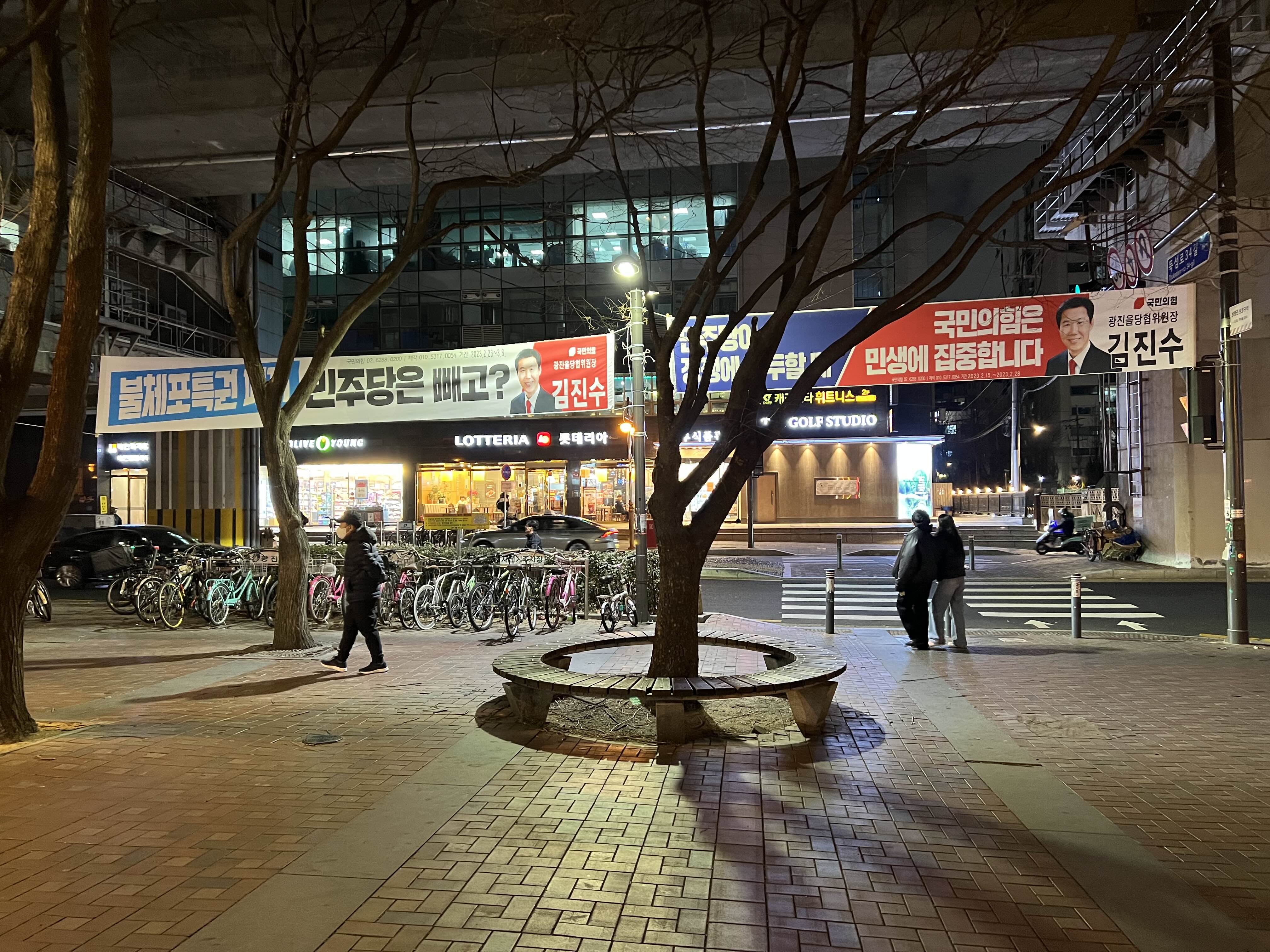 뚝섬유원지역 1번 출구 앞에는 늘 정치인들의 현수막이 지저분하게 걸려있습니다.
