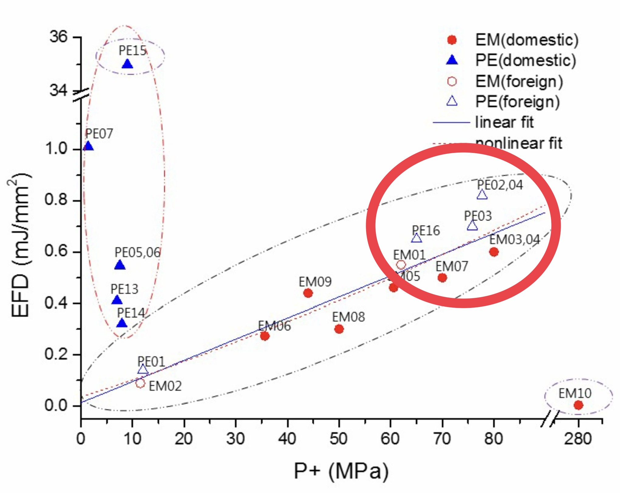 상관성분석에 포함된 모든 국내산 PE 방식제품(5개) 및 1개의 EM방식 국산 치료기는 P+ 및 EFD가 통상적인 범위를 크게 벗어나고 있으며, 예상되는 상관성을 따르지 않고 있어, 데이터의 신뢰성을 인정하기 어려운 상태