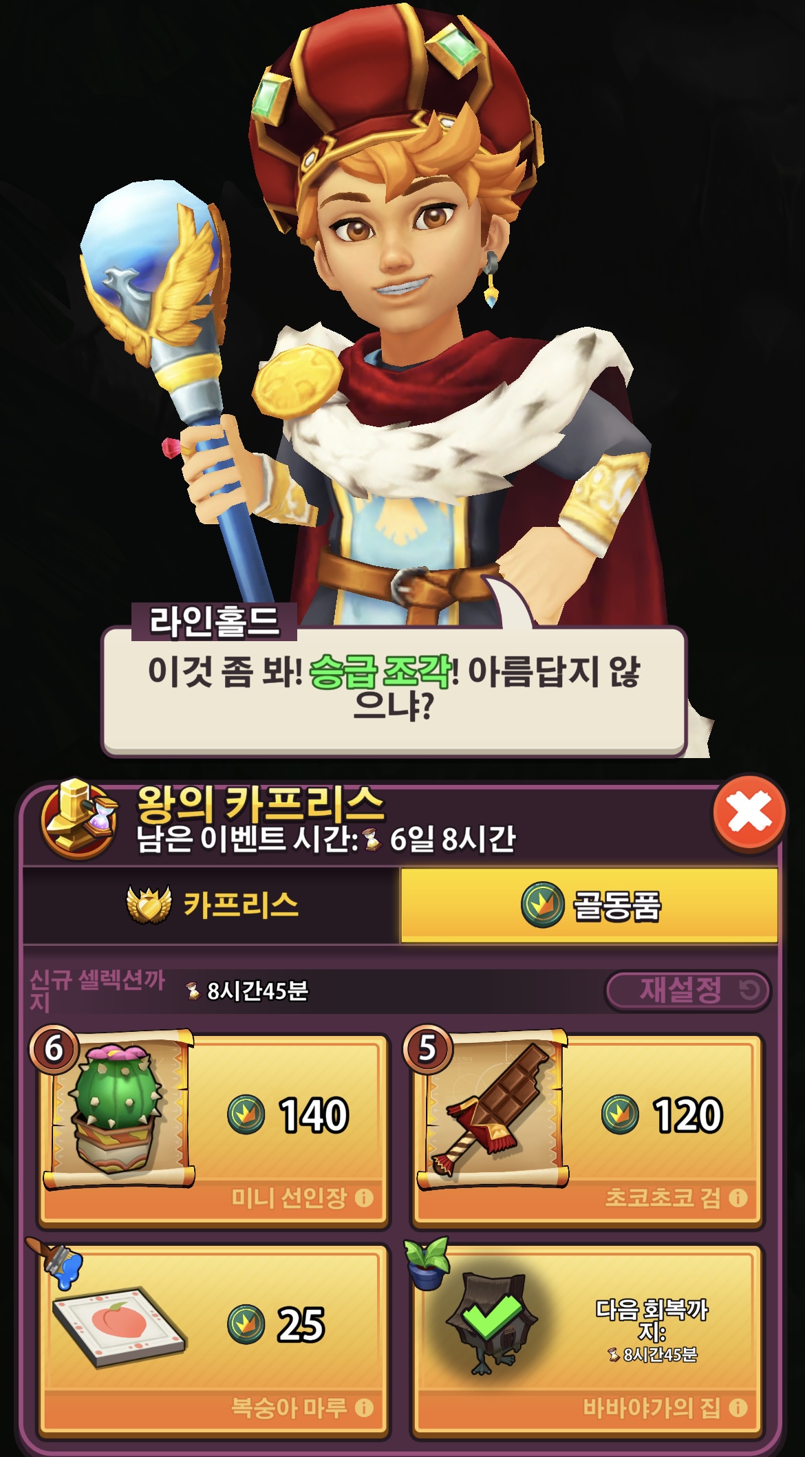 라인홀드 왕의 아이템 요구는 매시간 랜덤으로 바뀝니다.