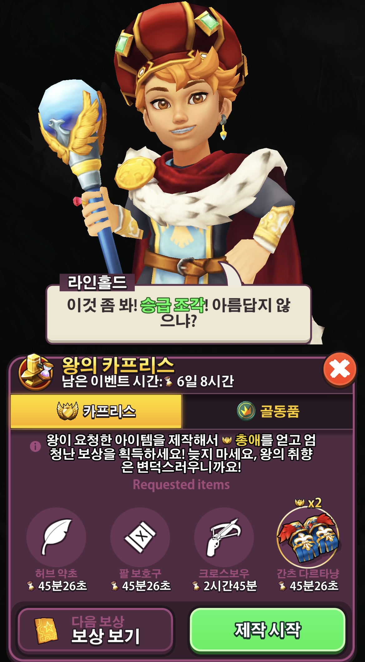 라인홀드 왕이 원하는 아이템을 정말로 ‘제작만’하면 됩니다.
