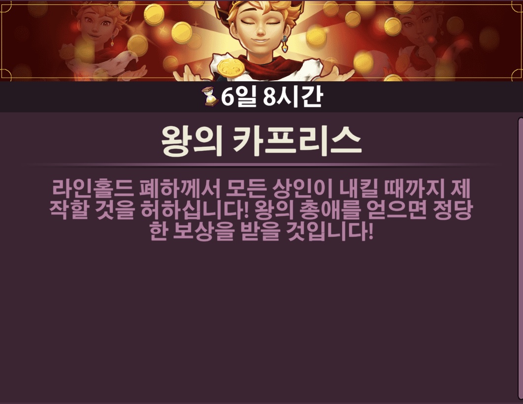왕의 카프리스 이벤트는 길드원들과 함께 진행하는 이벤트이며 금요일에 시작되어 7일간 진행됩니다.