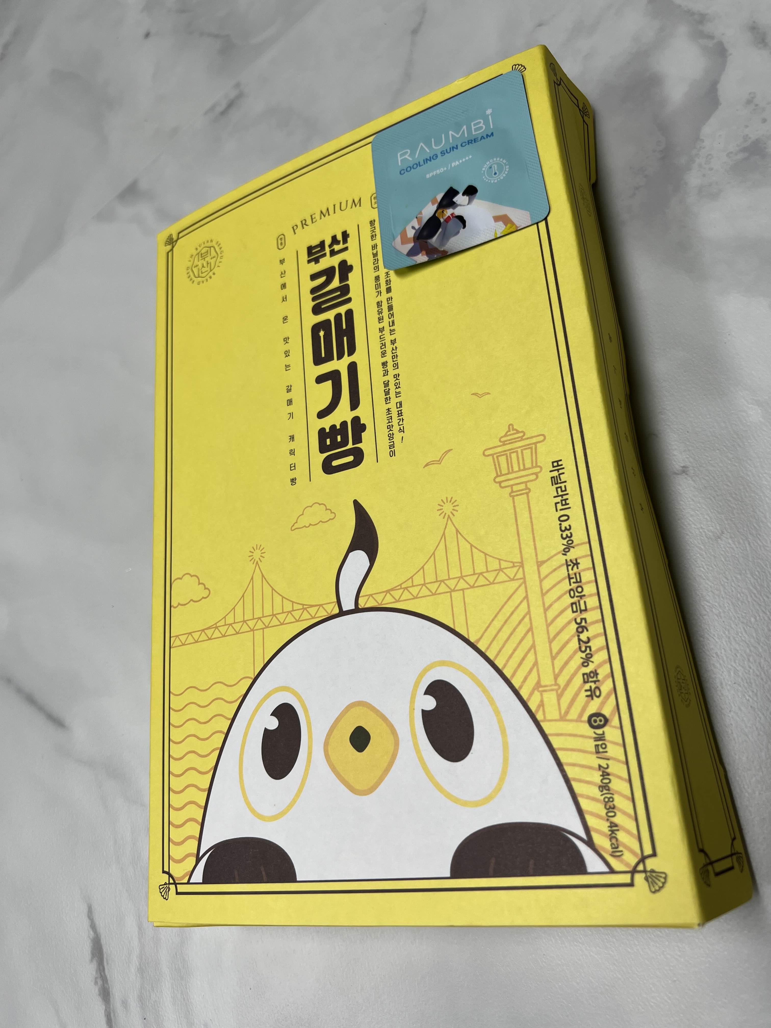 귀여운 노란색의 종이 케이스입니다. 광안리 선물샵에서 구매했는데, 오른쪽 위에는 사은품으로 작은 선크림이 붙어있네요.
