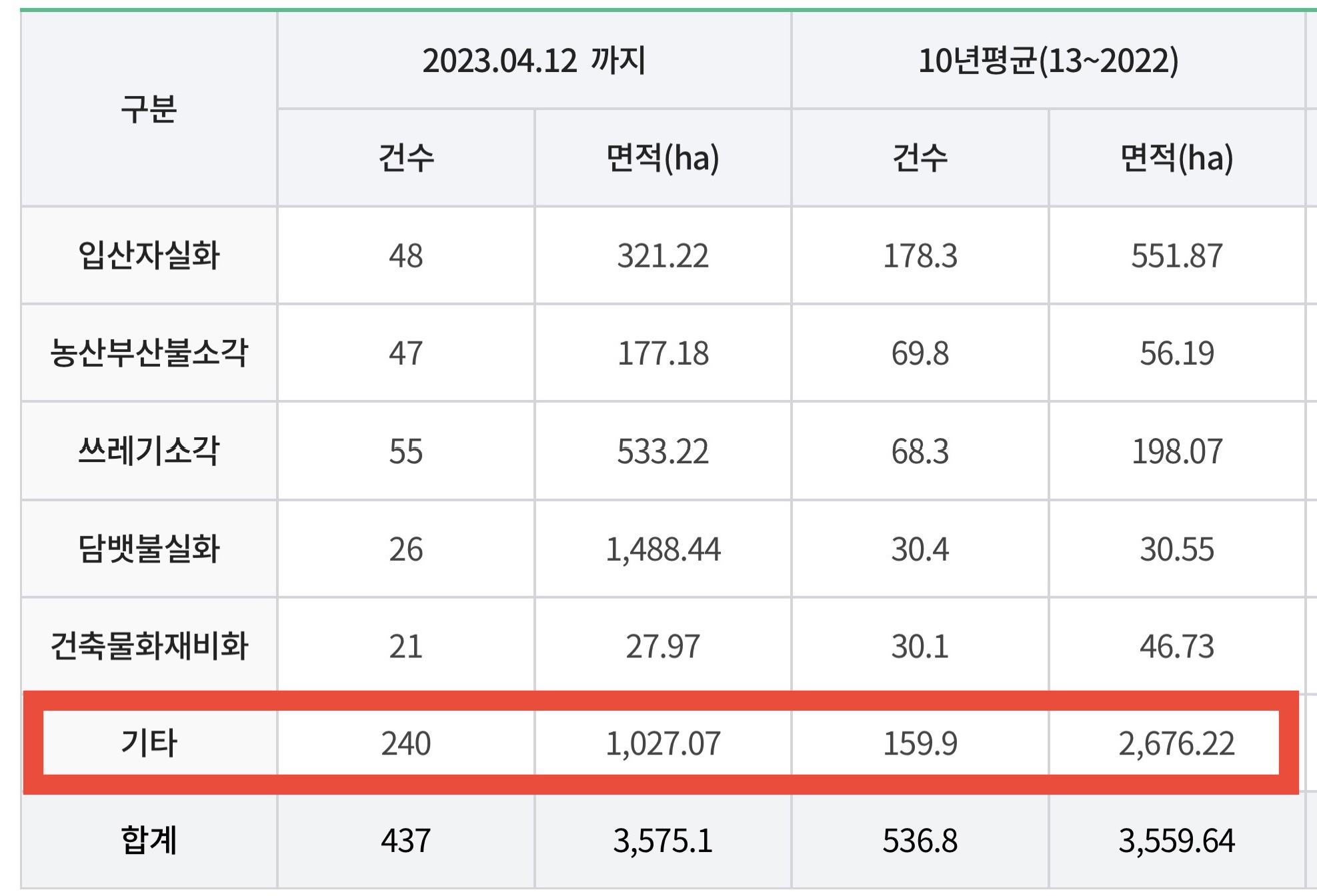 올해 2023년의 4월 10일 까지는 441건의 산불이 발생했는데,