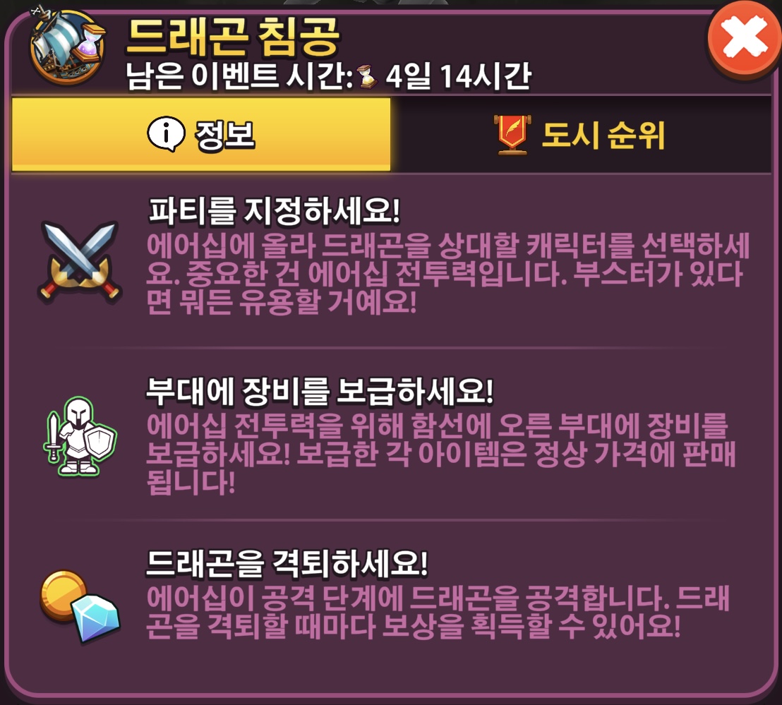 - 드래곤 침공은 우리나라 시간을 기준으로 저녁 8시에 에어십이 출발함. 때문에 그전까지 준비를 마쳐야 함. 아직 시간이 좀 남았네? 하다가 영웅을 못 태운 사람을 여러 번 봄. 웬만하면 미루지 말고 미리 태워놓자.