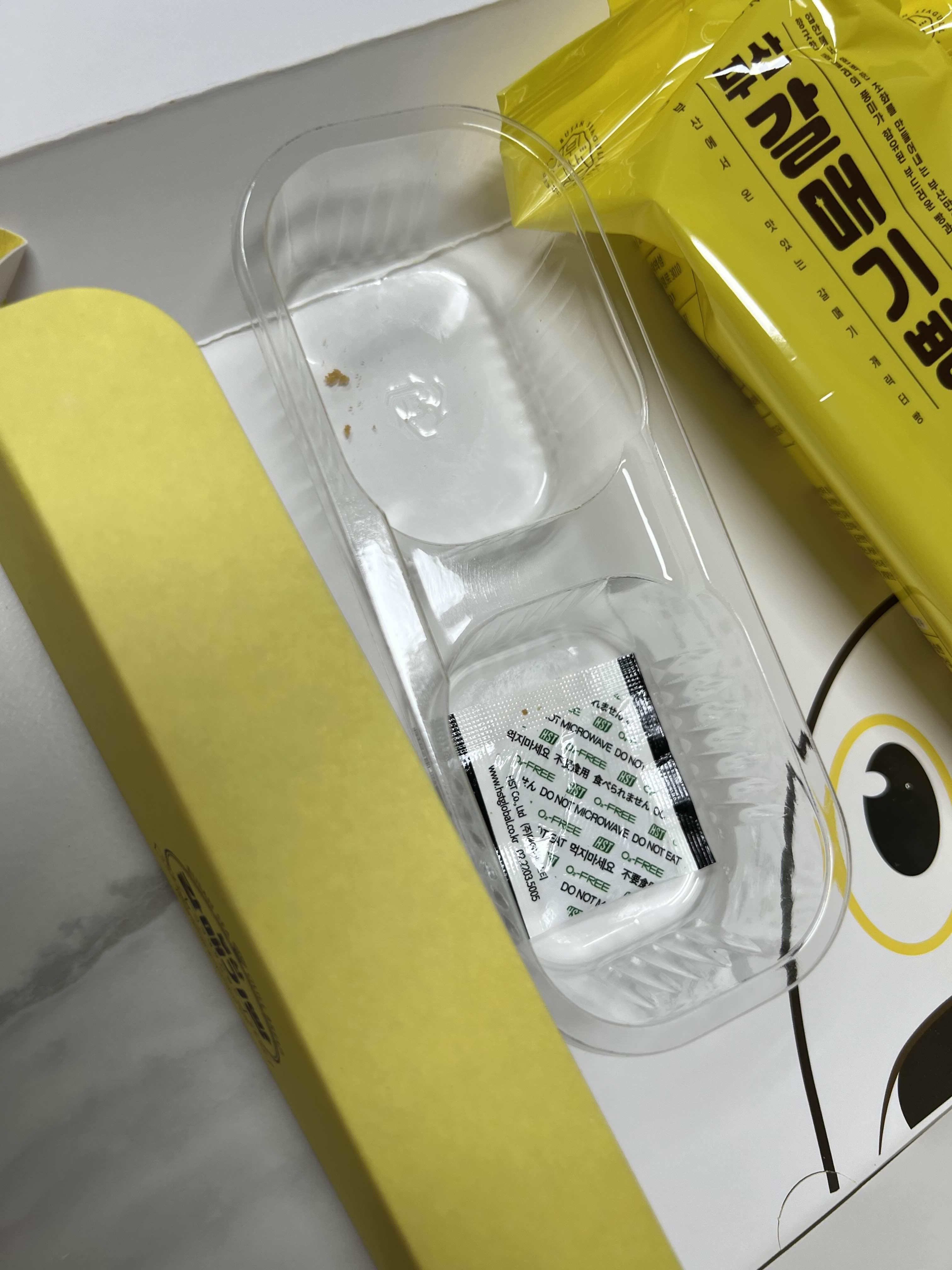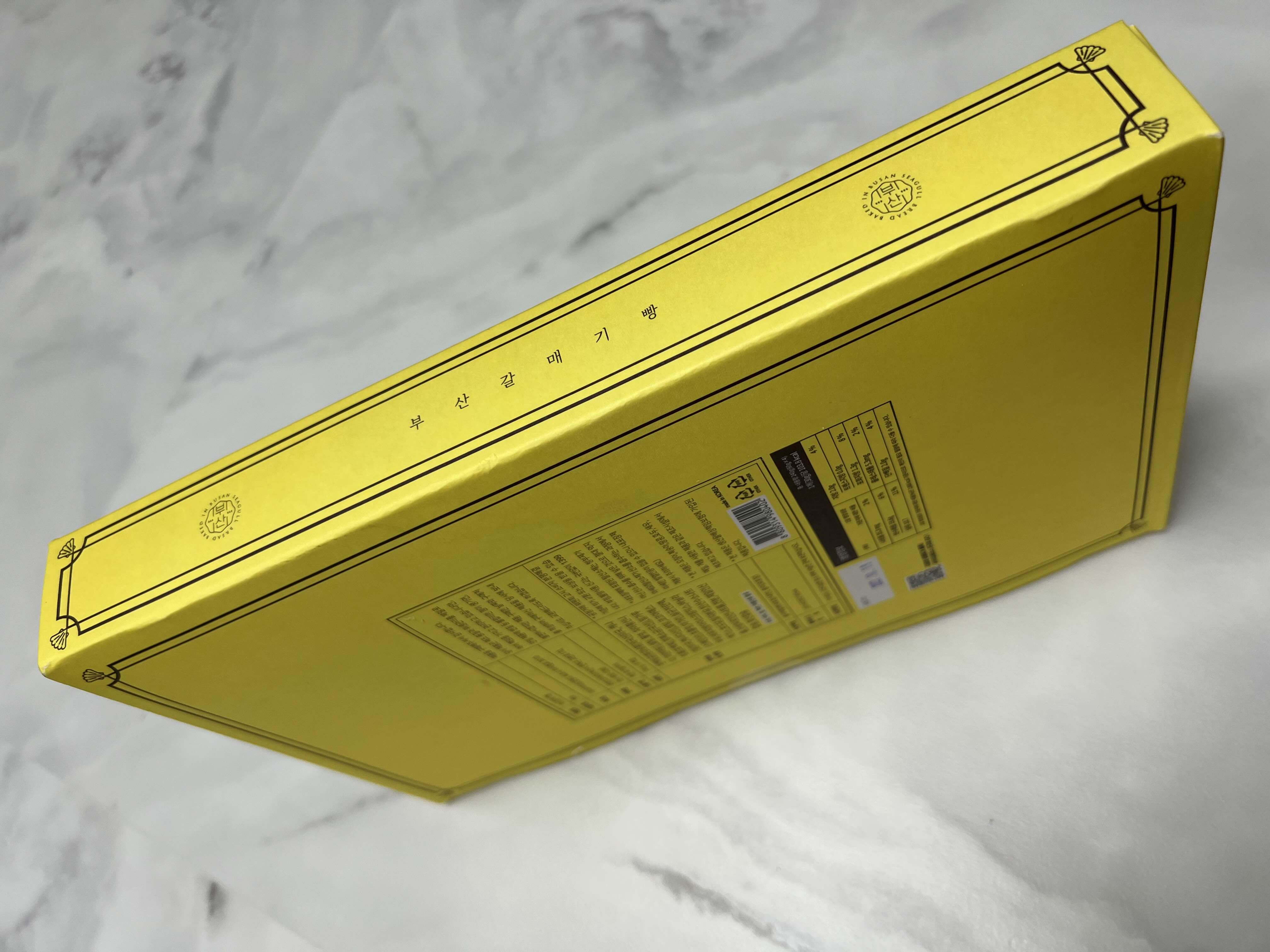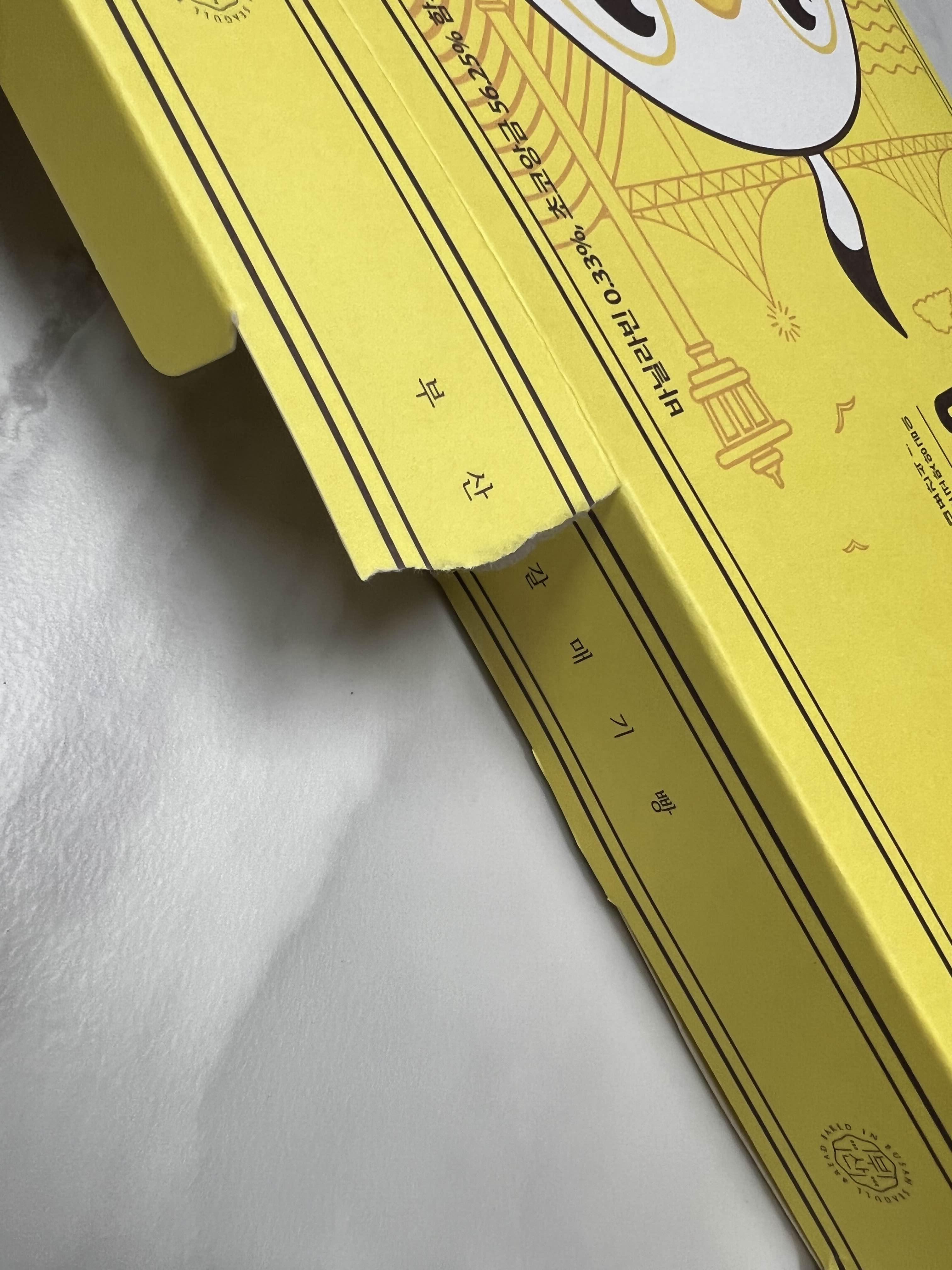 귀여운 노란색의 종이 케이스입니다. 광안리 선물샵에서 구매했는데, 오른쪽 위에는 사은품으로 작은 선크림이 붙어있네요.