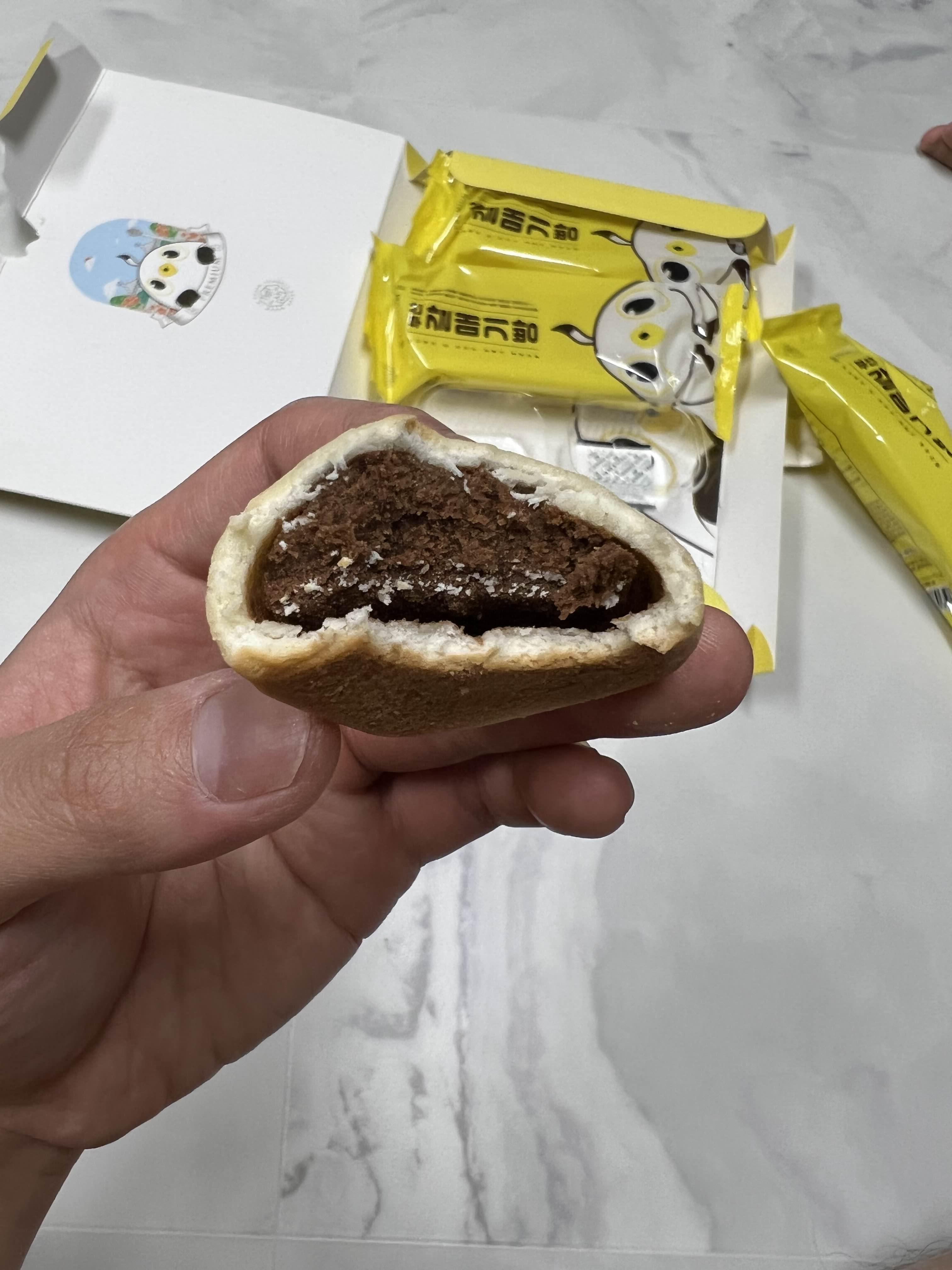 가공된 식품이라 그런지 한여름의 차 안에서도 좋은 상태를 유지했던것 같고 초코 앙금의 56.25% 함유량 덕분인지 앙금이 적당히 달고 맛있었습니다. 사실 초코 맛이라기 보단 코코아 맛이 더 강한 느낌이었어요. 초코 맛 보단 코코아 파우더 같은 느낌. 겉 빵도 부드러웠습니다.