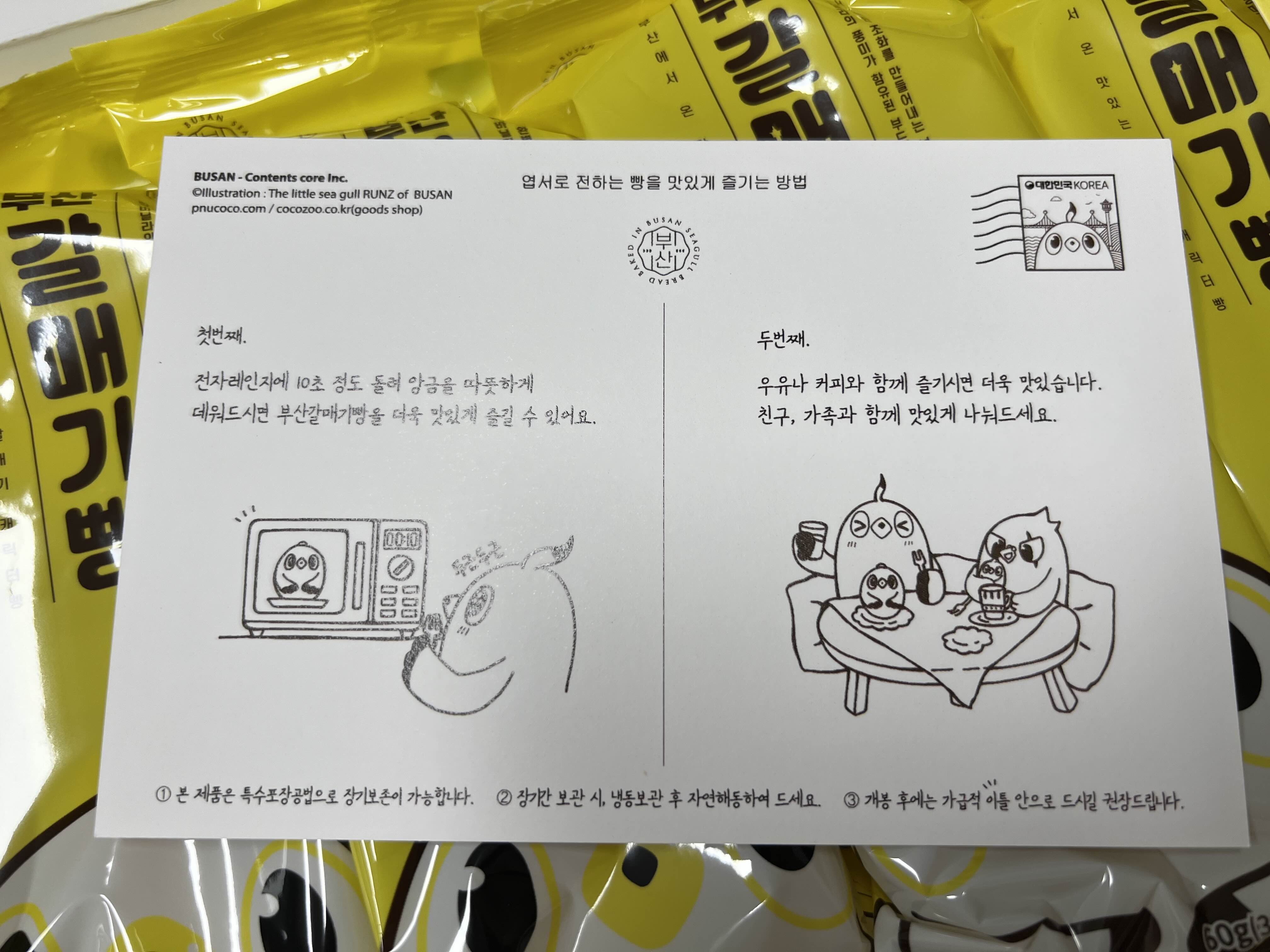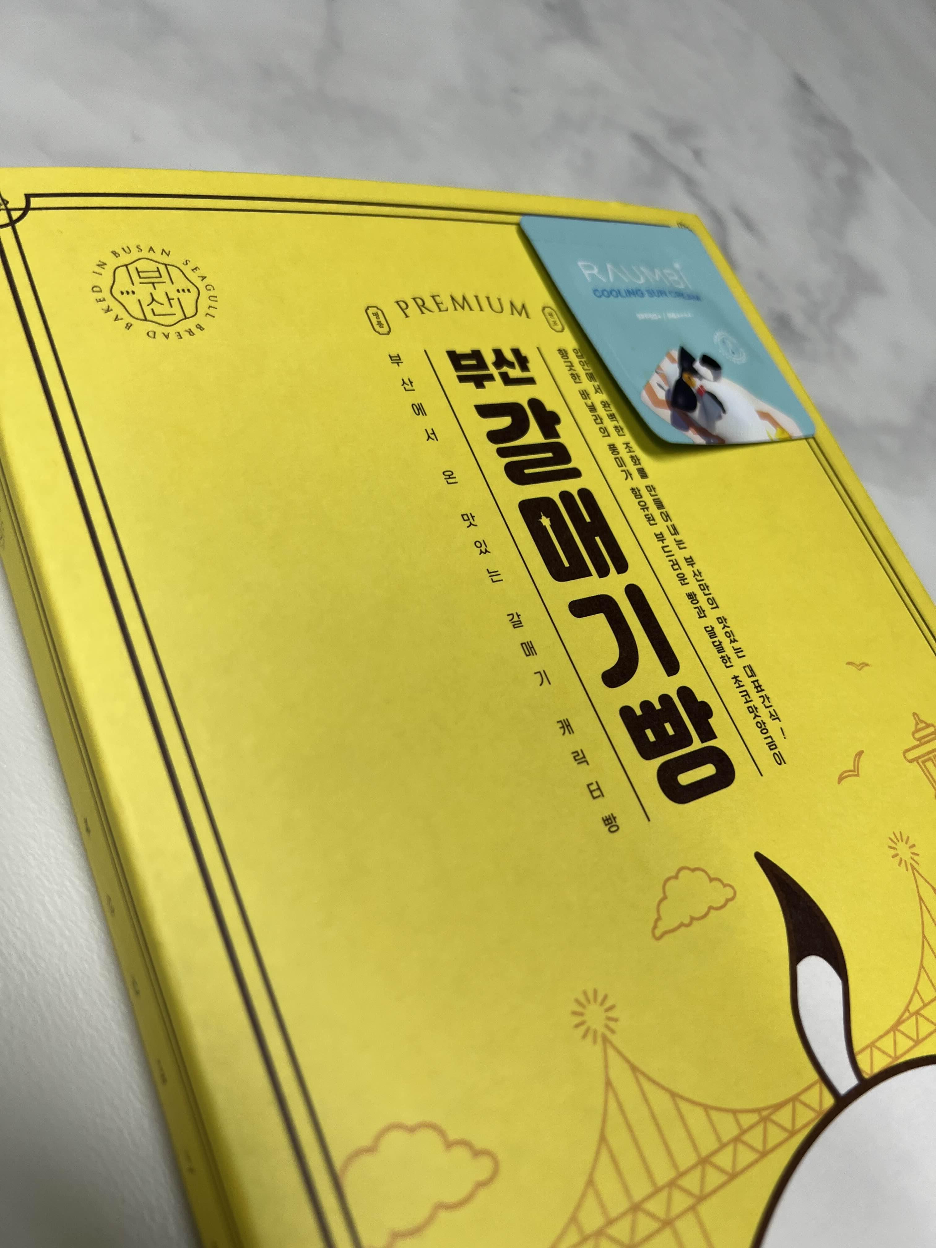 부산 갈매기빵이라고 예쁜 글씨로 써져있습니다. 동그란 테이프로 봉인 되어있어요.