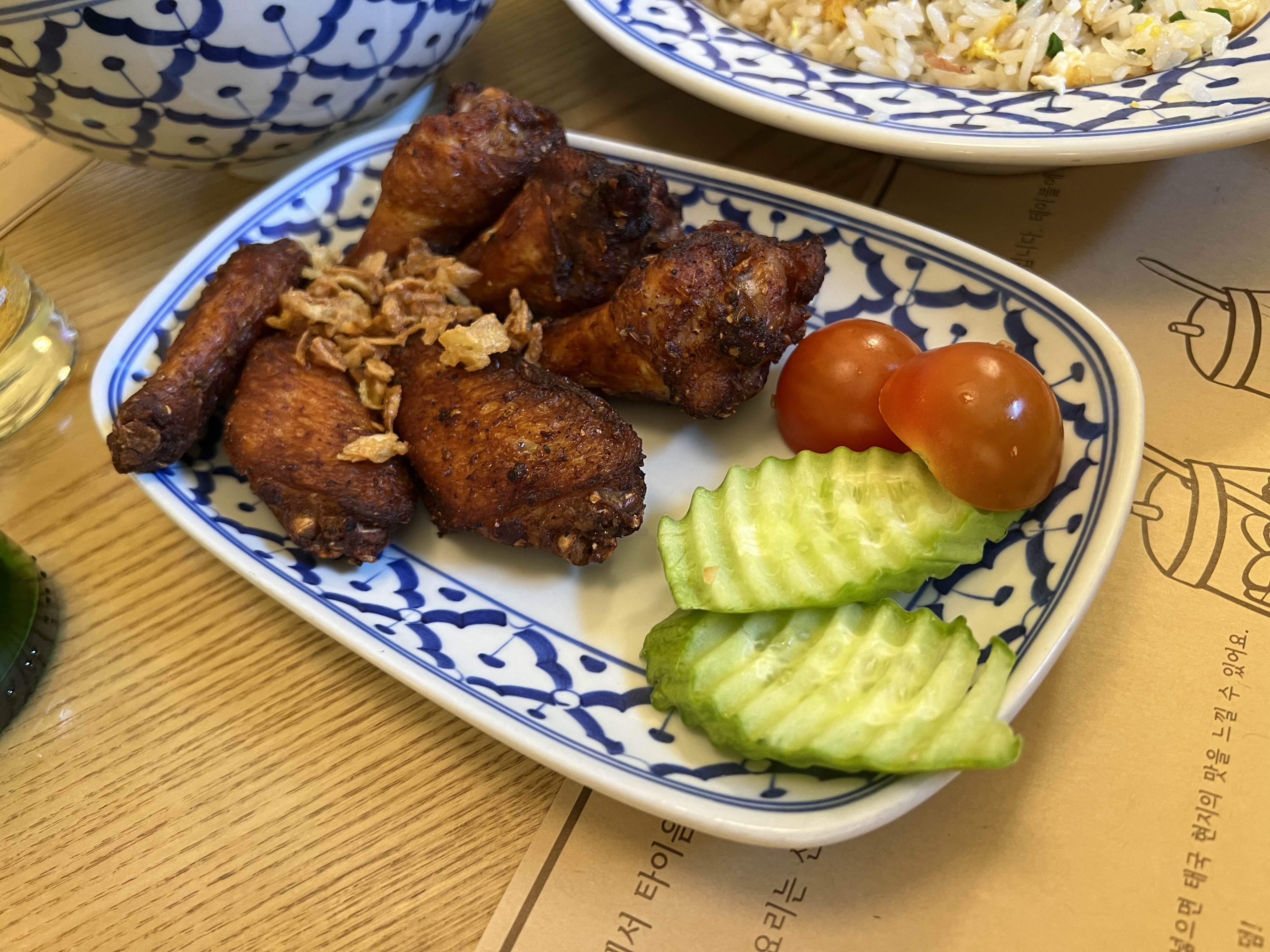 바삭하게 튀긴 닭날개에 특제 소스를 뿌려 만든 듯한데