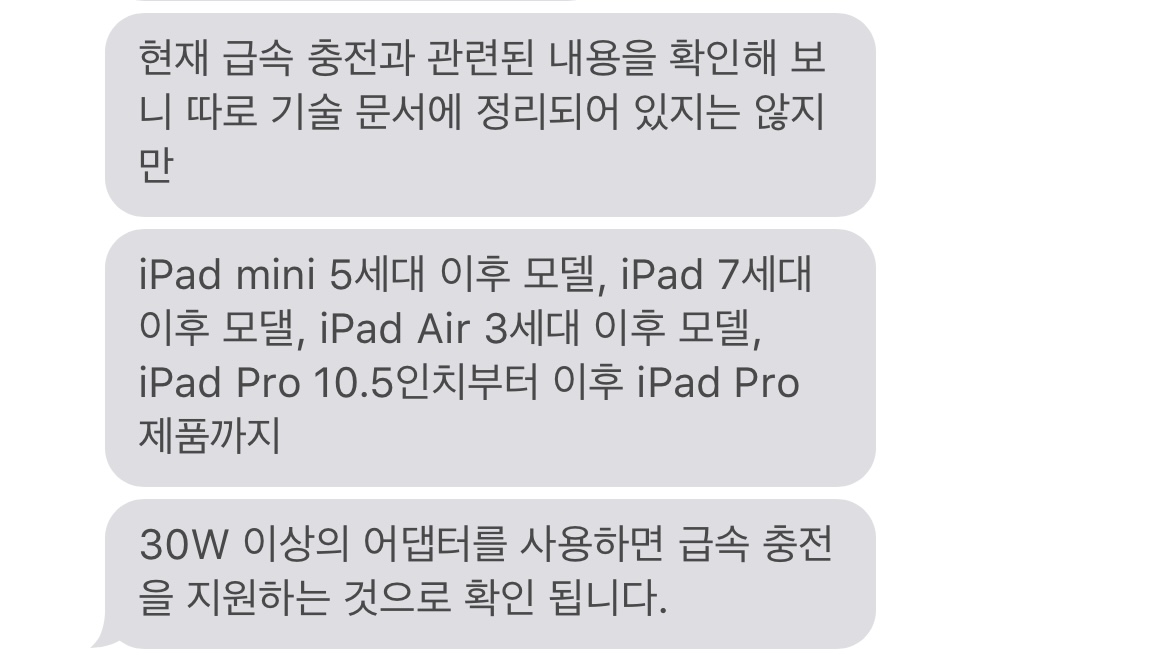 iPad mini 5세대 이후 모델, iPad 7세대 이후 모델, iPad Air 3세대 이후 모델, iPad Pro 10.5인치부터 이후 iPad Pro 제품까지 급속 충전을 지원하고