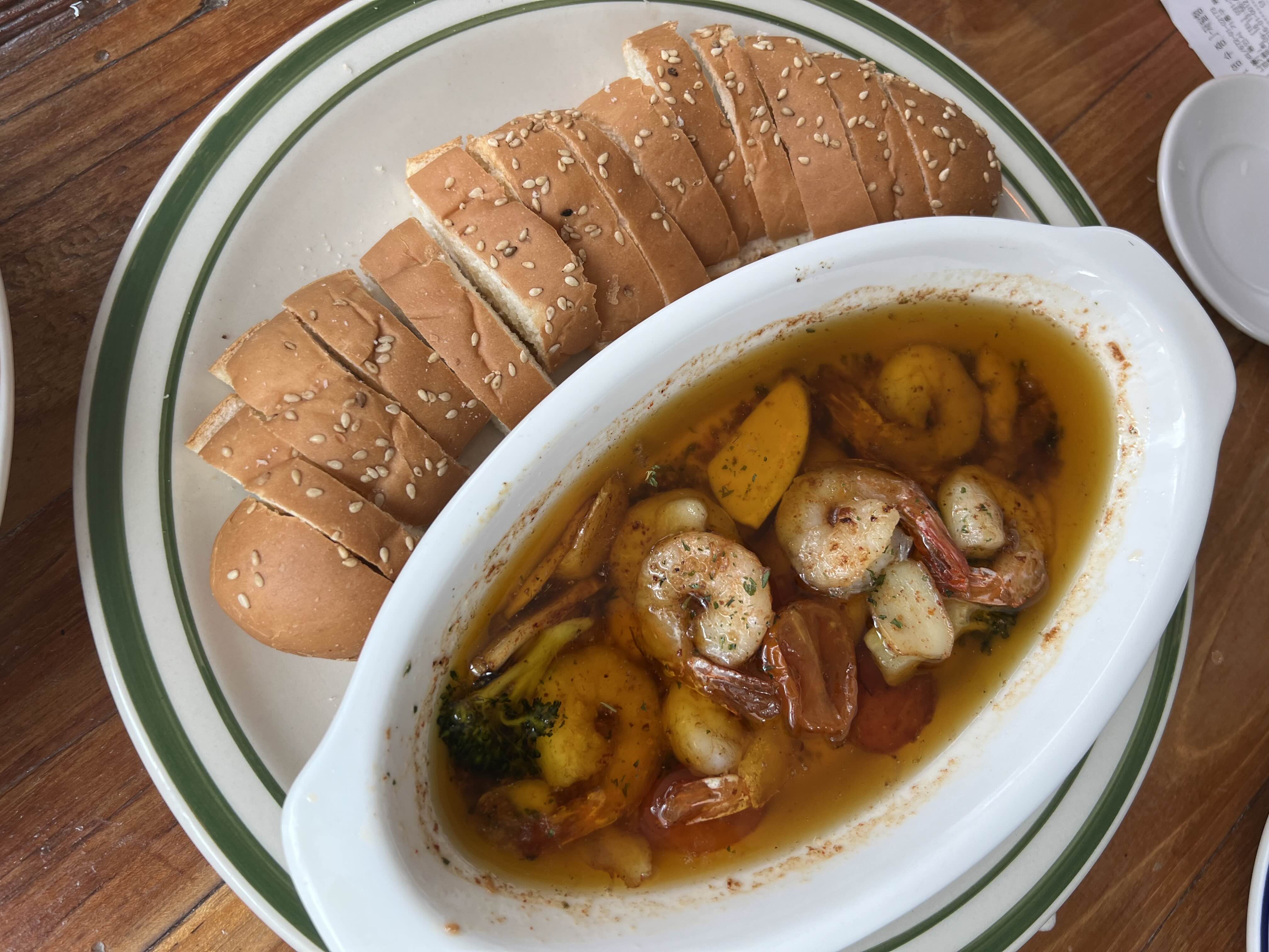 바삭한 바게트와 함께 약간은 매콤한 맛이 느껴진 갈릭 쉬림프.