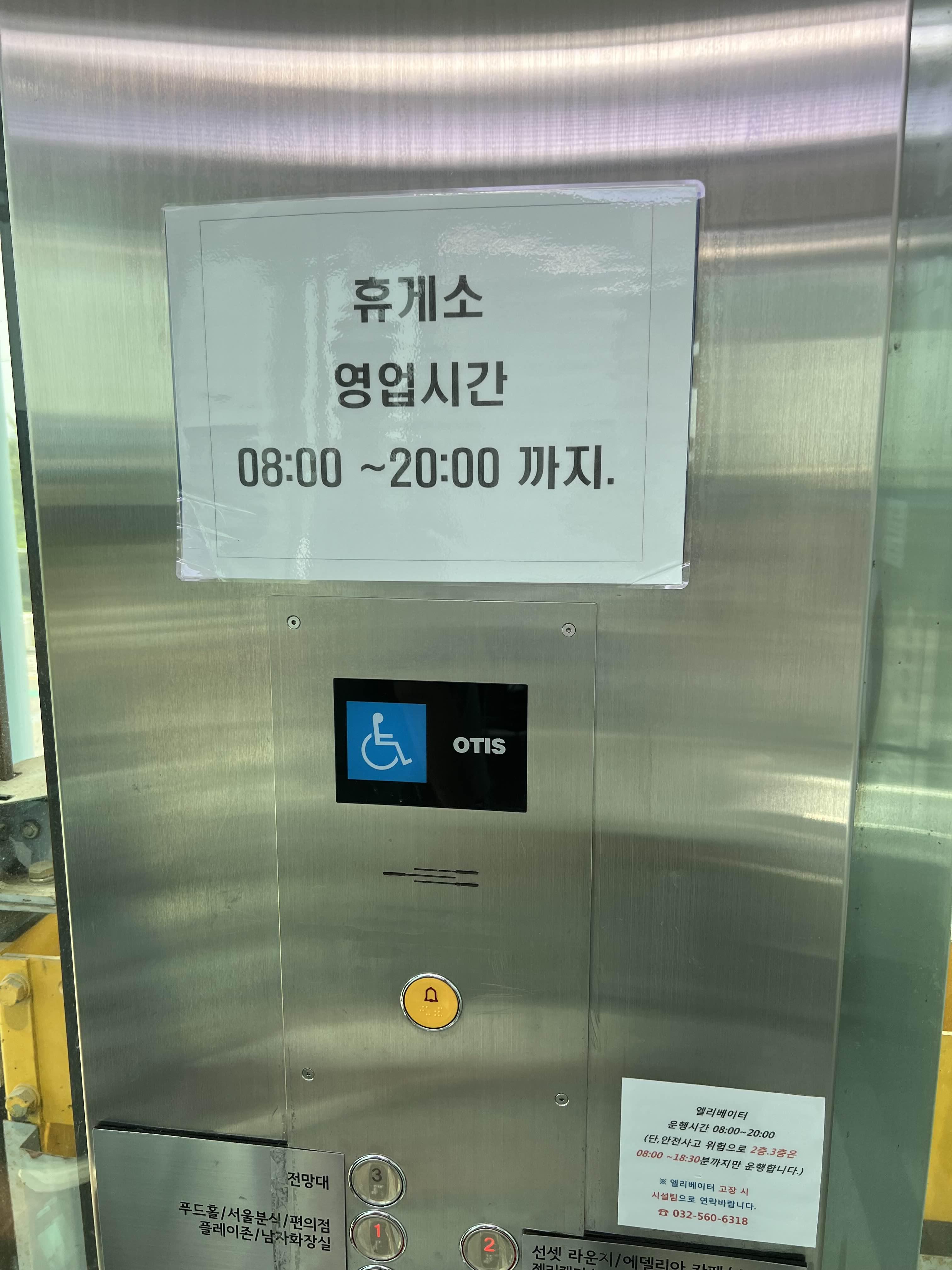 엘리베이터 내부에는 휴게소 영업시간이 안내되어 있습니다. 영종대교 휴게소의 영업시간은 08:00부터 20:00까지입니다.