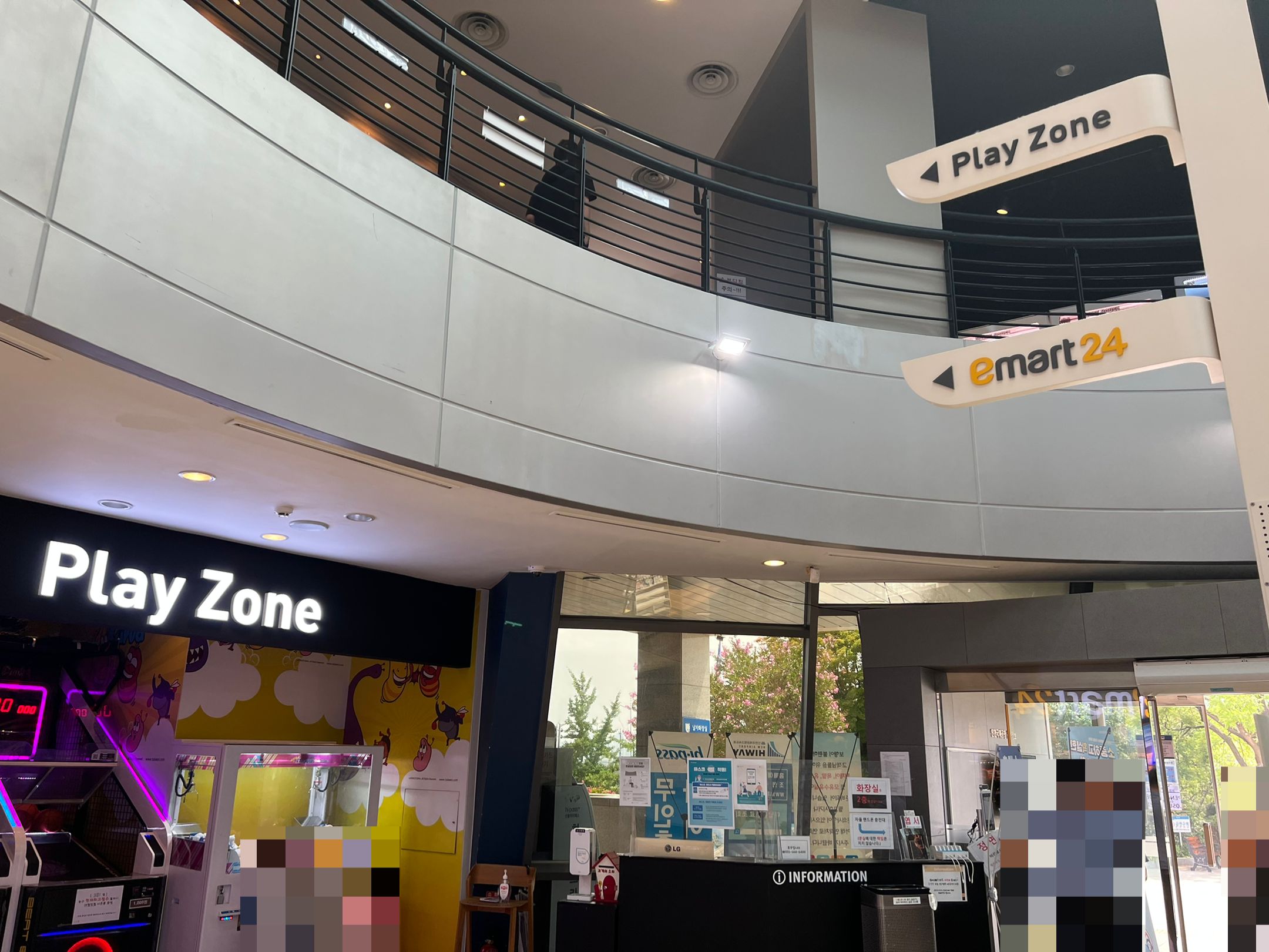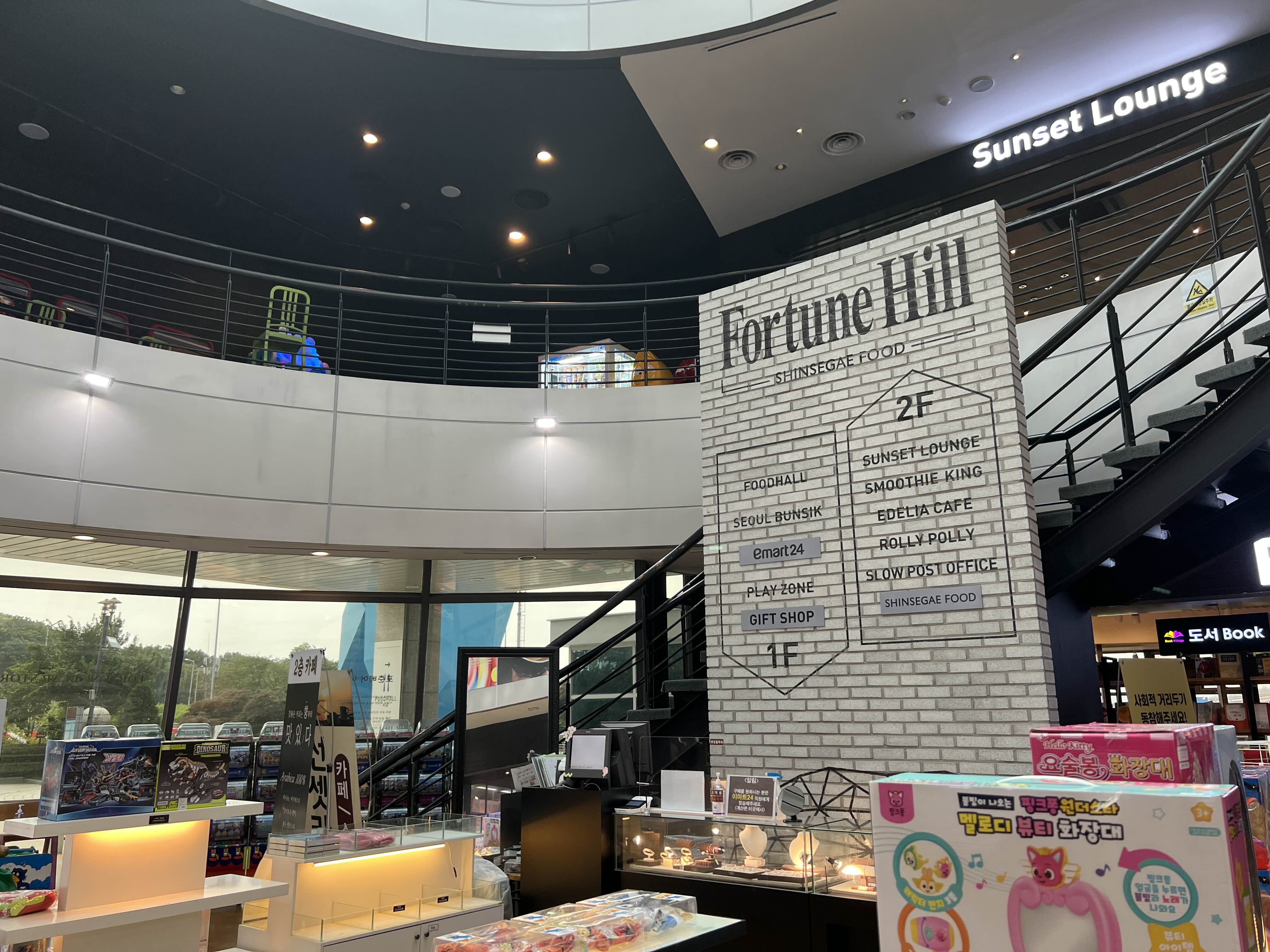 1층에 진입했습니다. 식당과 편의점, 게임시설 등이 있고 2층으로 올라갈 수 있는 계단이 있습니다.