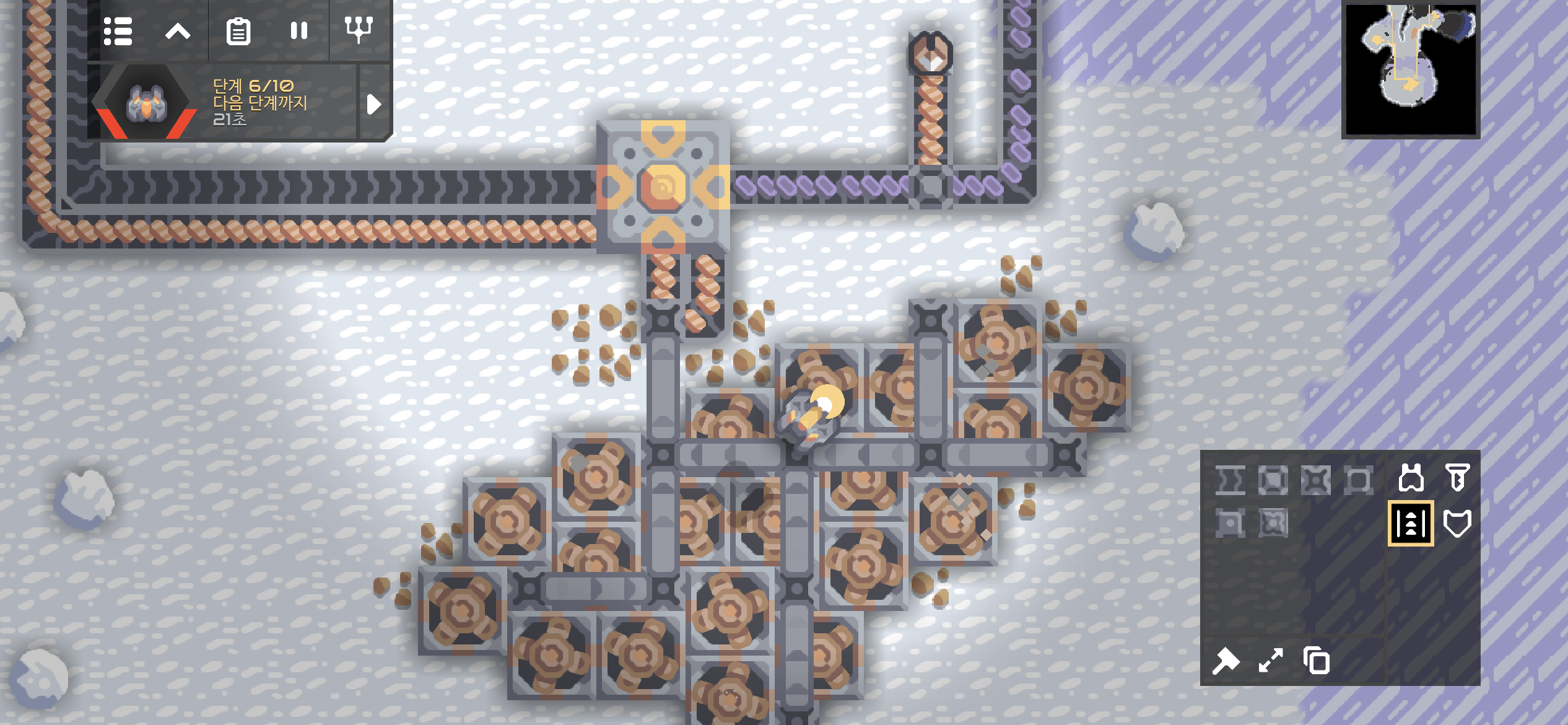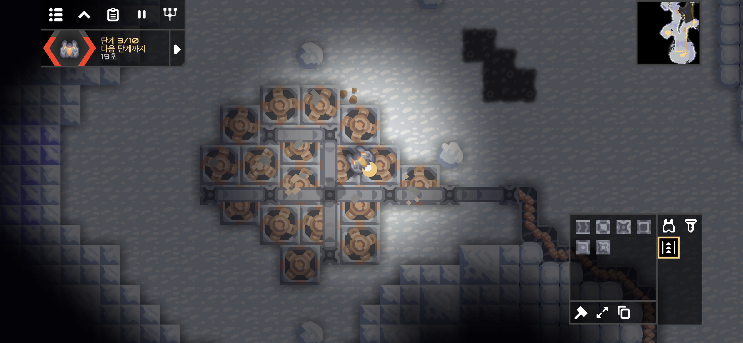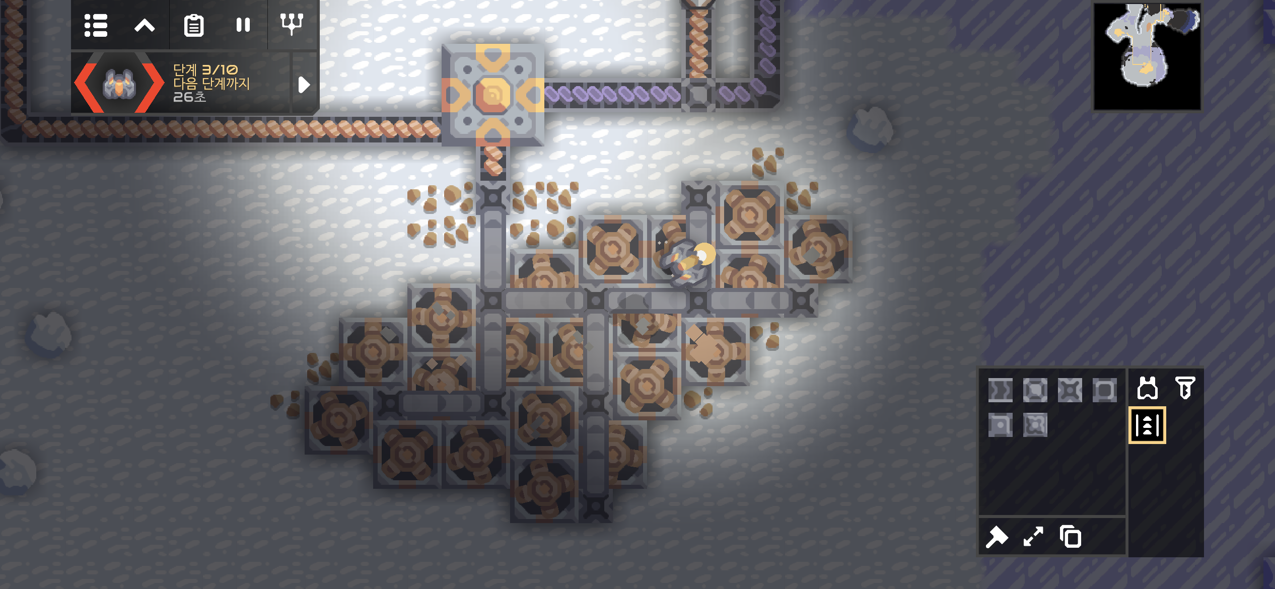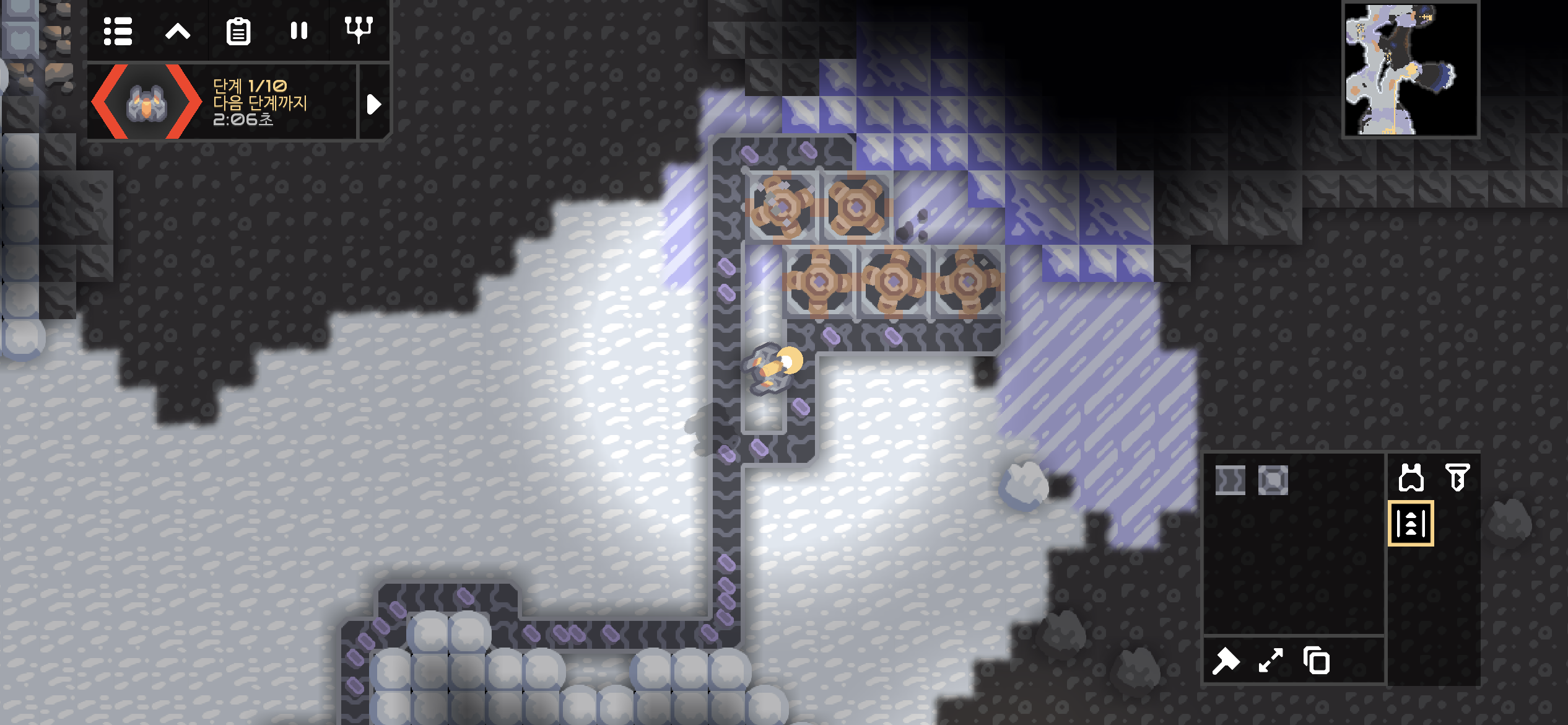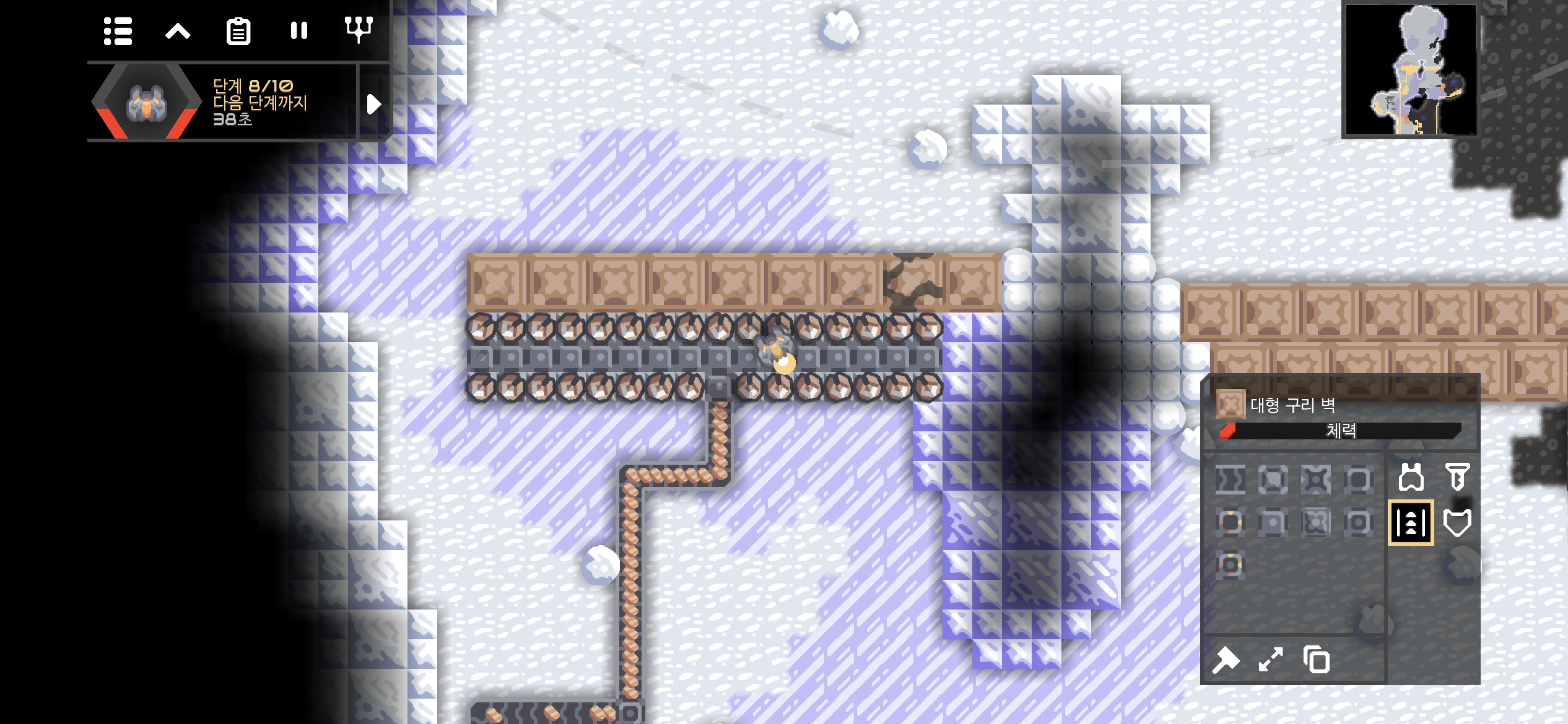 단계별로 등장하는 적 유닛의 처리가 점점 번거로워져 터렛을 배치하기로 합니다. 적이 이동 가능한 경로중 한 곳은 대형 구리 벽으로 막아버립니다.