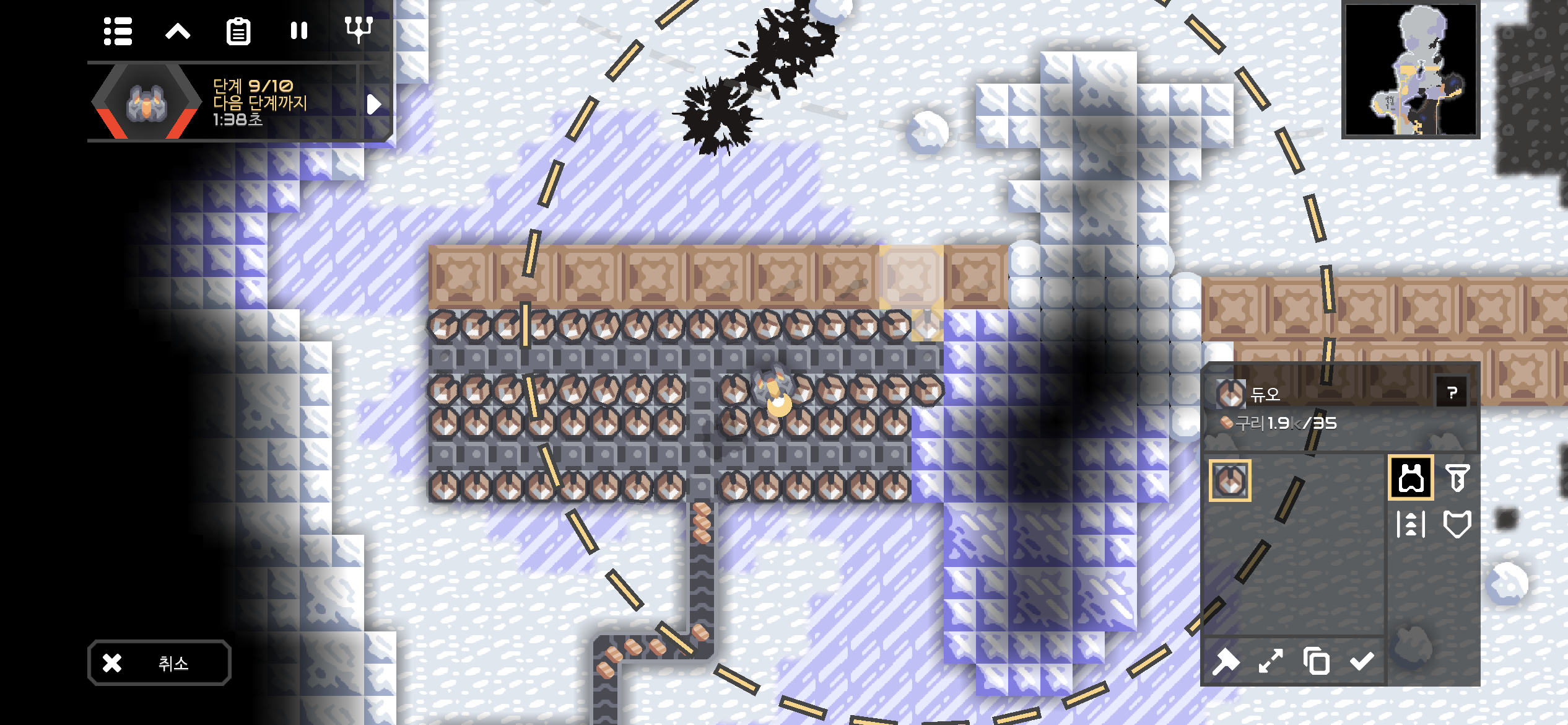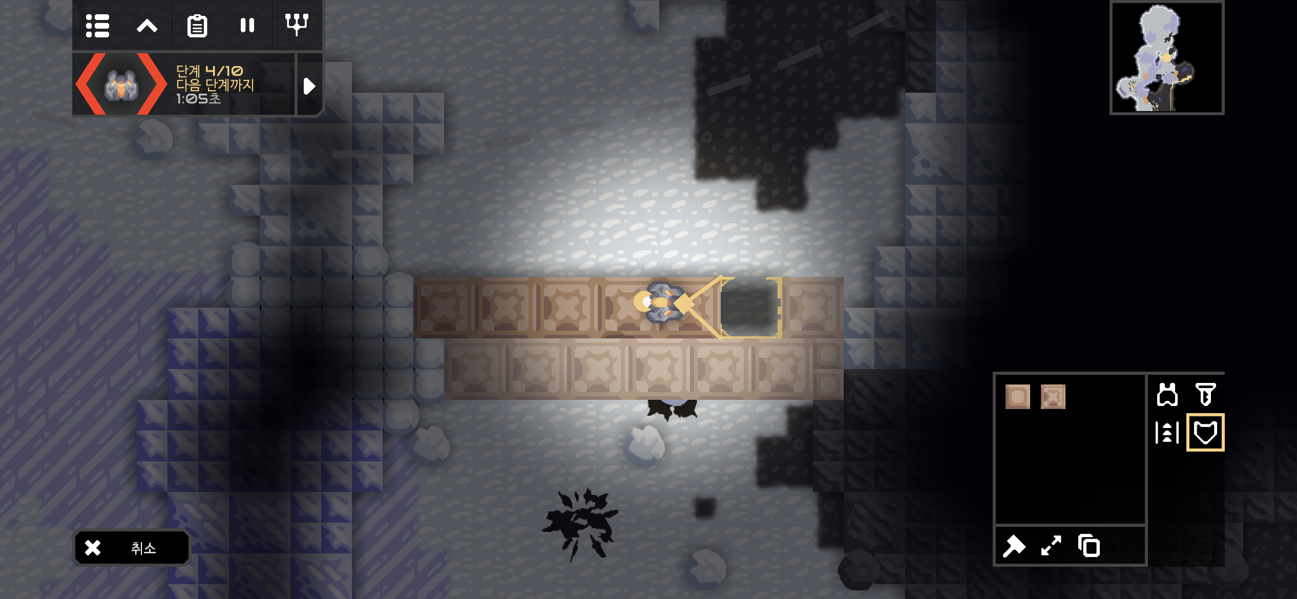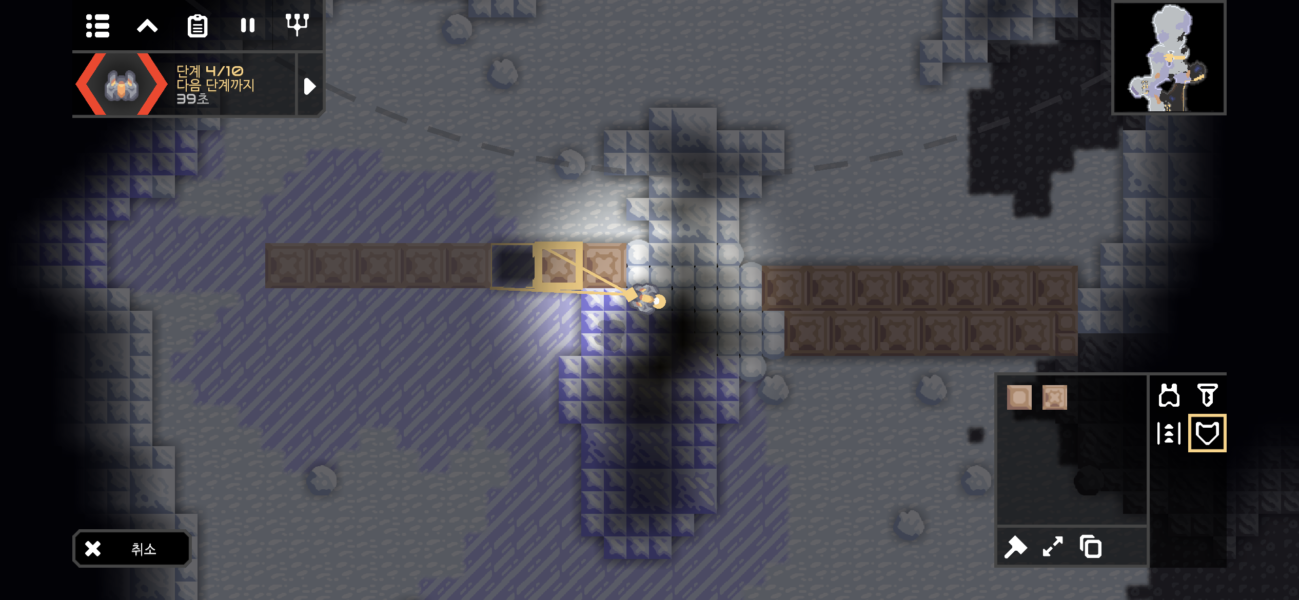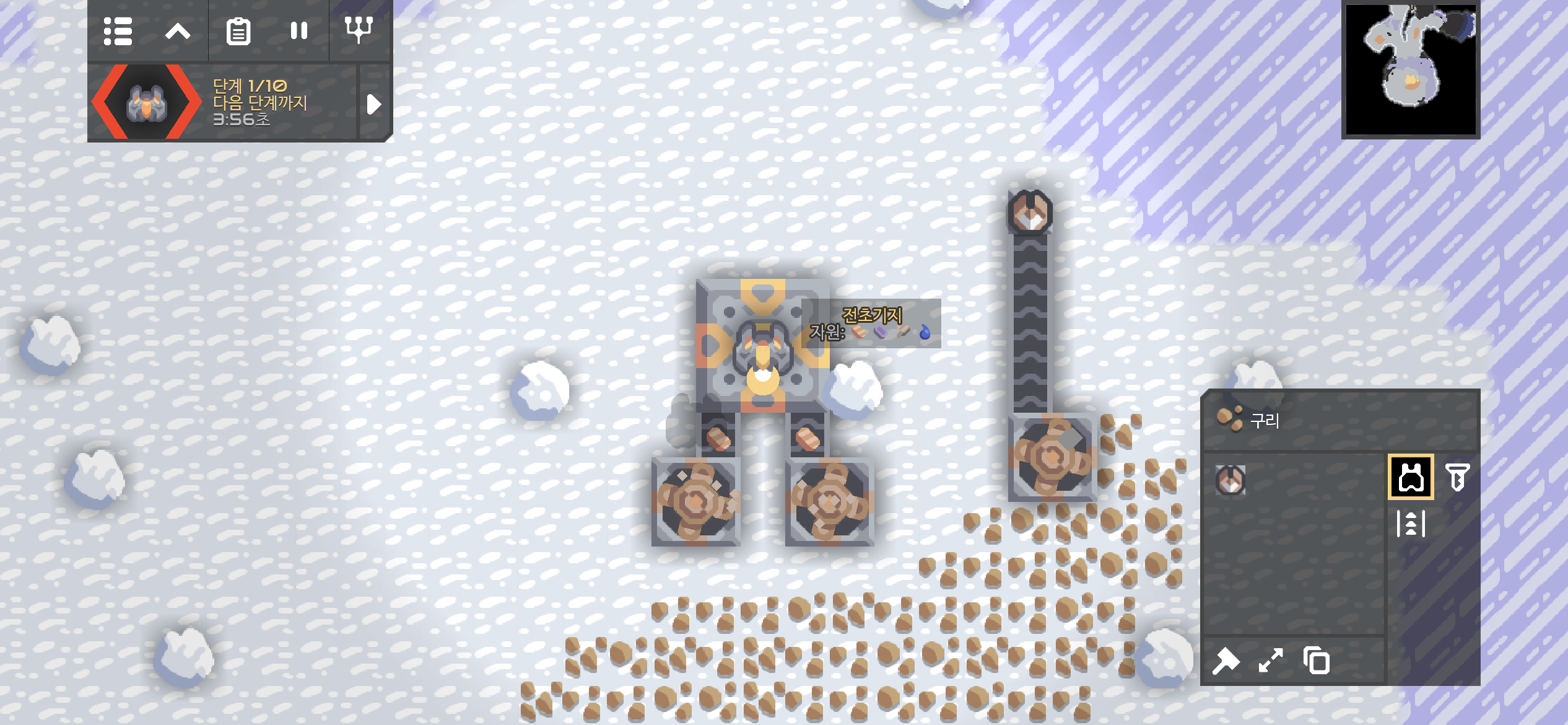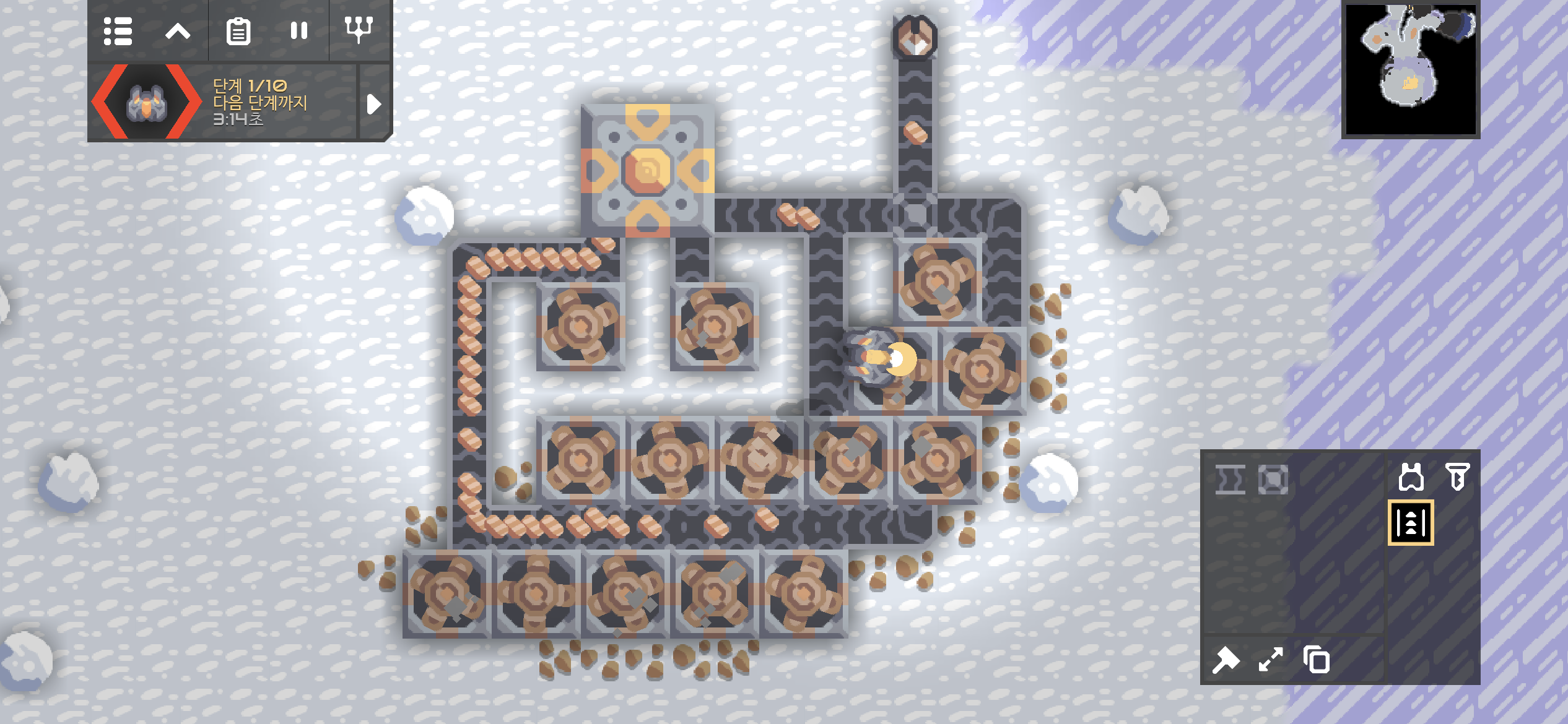 단계별로 등장하는 적 유닛의 처리가 점점 번거로워져 터렛을 배치하기로 합니다. 적이 이동 가능한 경로중 한 곳은 대형 구리 벽으로 막아버립니다.