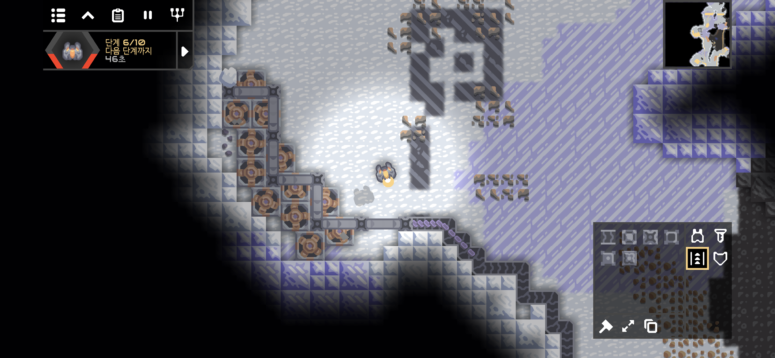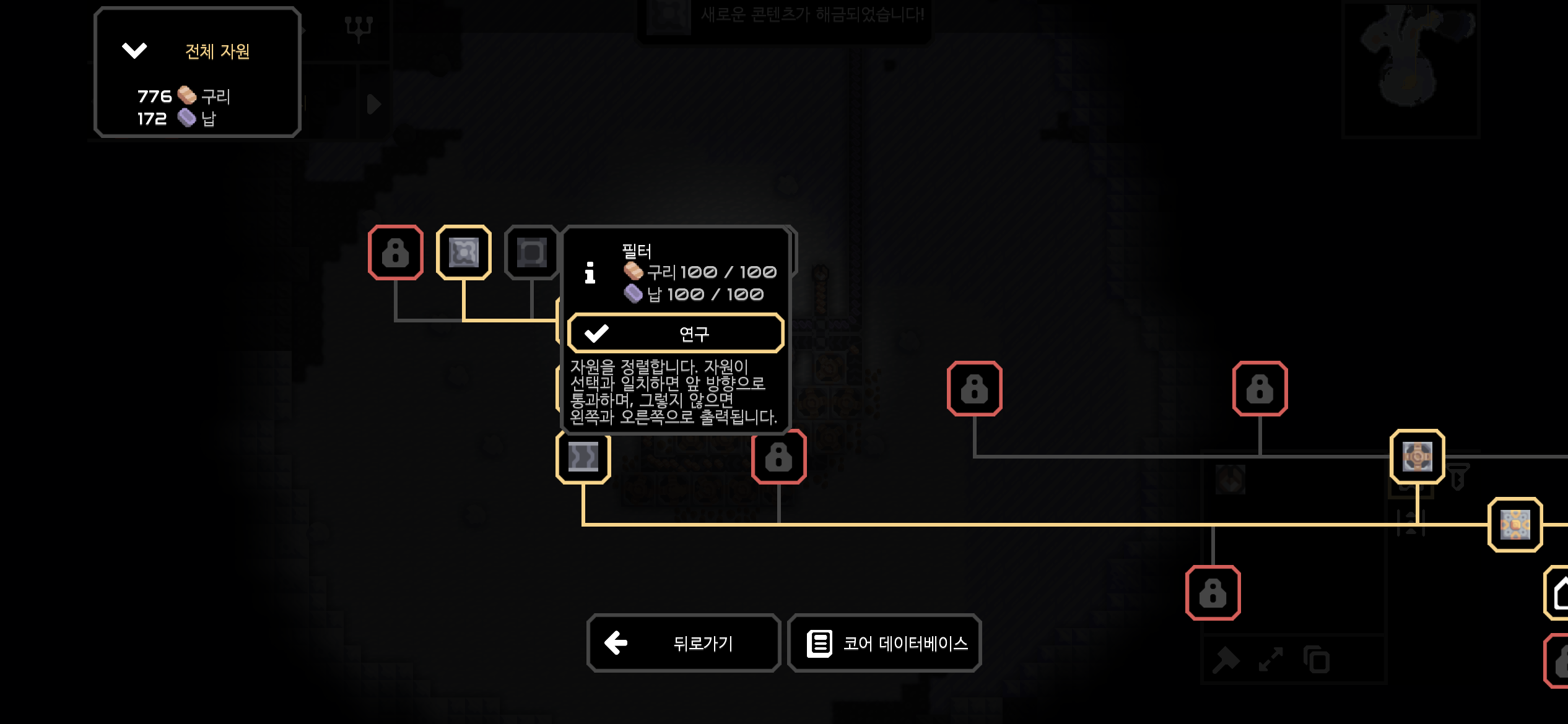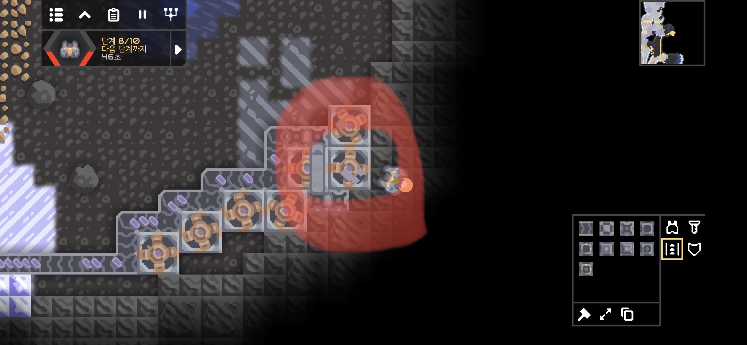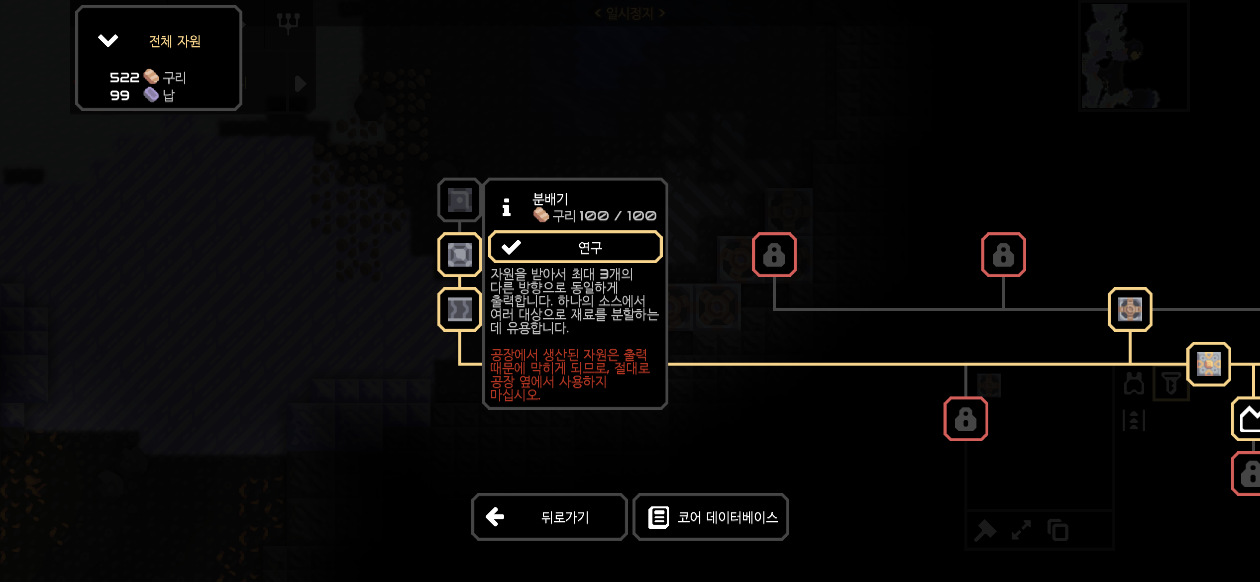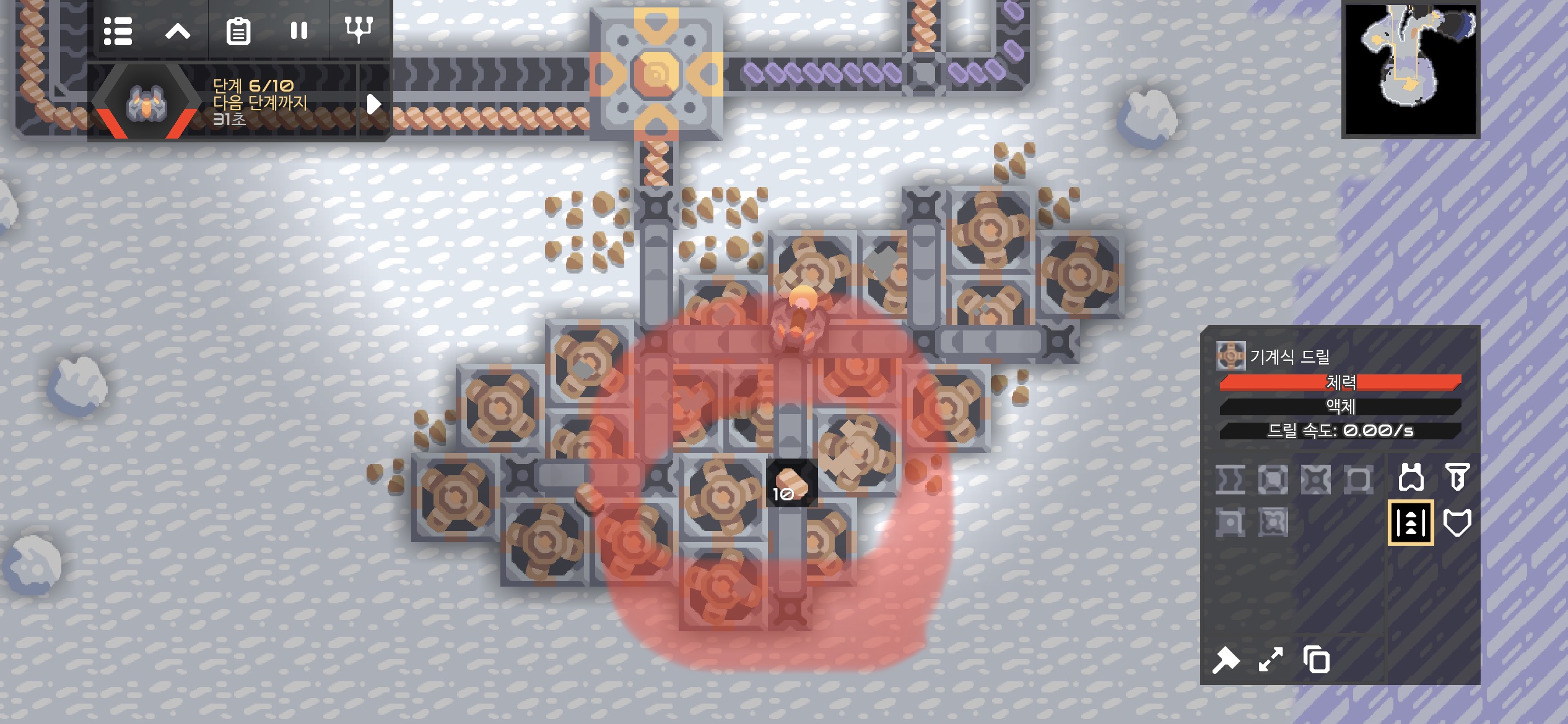 디펜스 라인의 구리가 가득차게 되어 기계식 드릴이 멈췄습니다. 이전에 연구했던 포화 필터를 이용해 가득찬 자원은 코어로 가도록 컨베이어를 연결합니다.