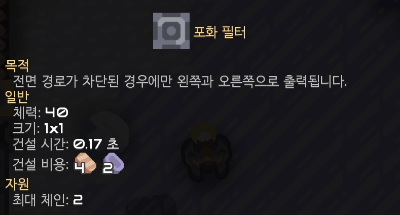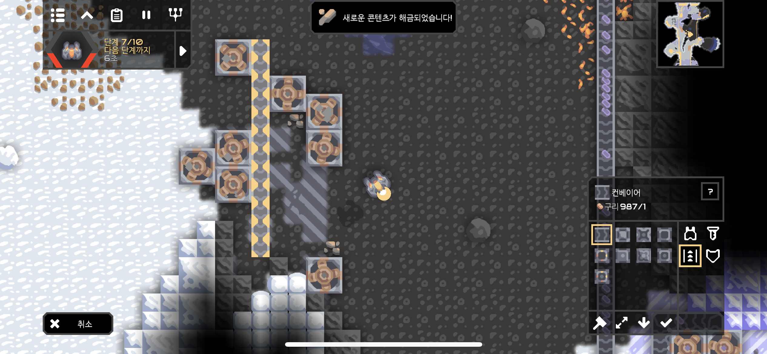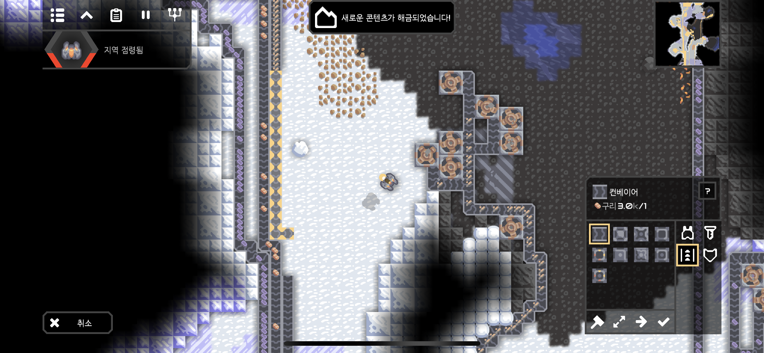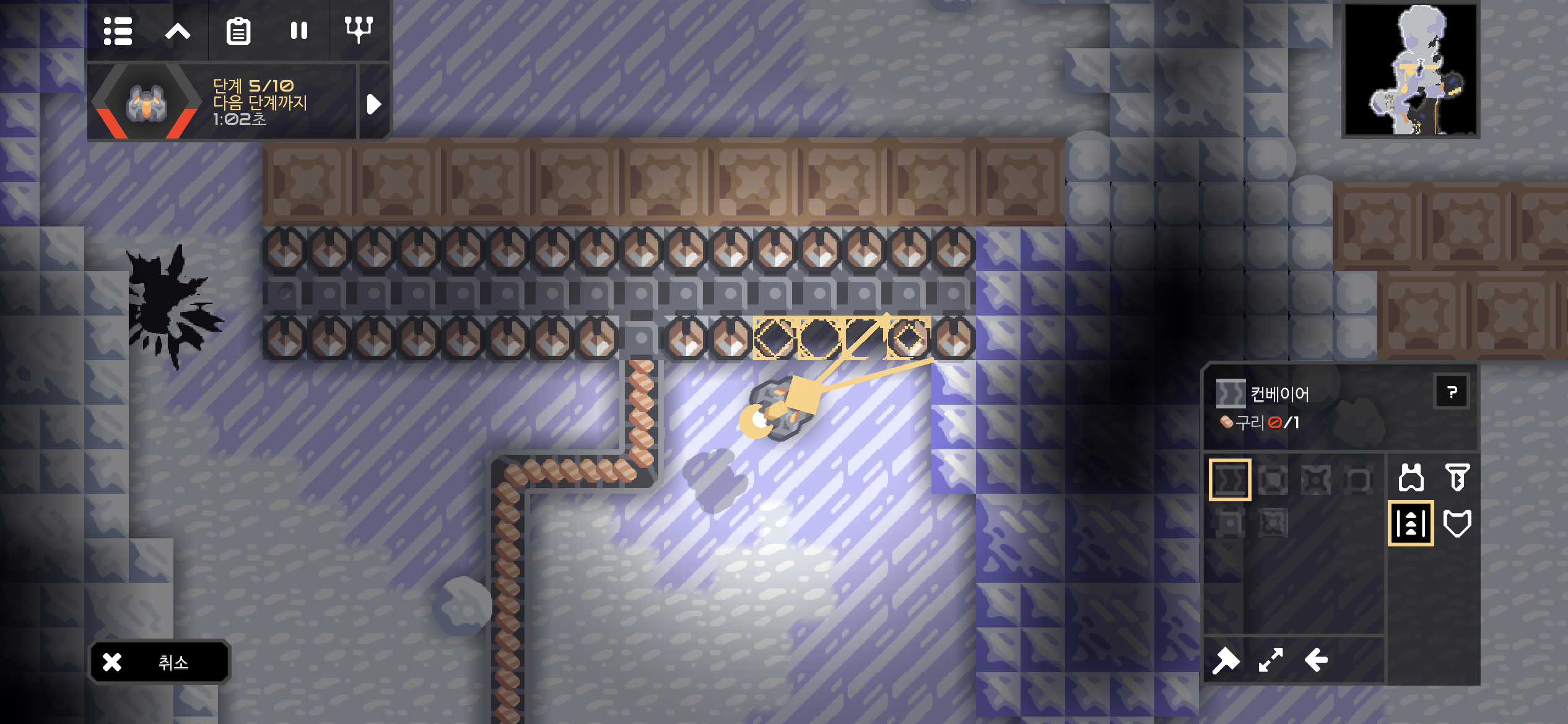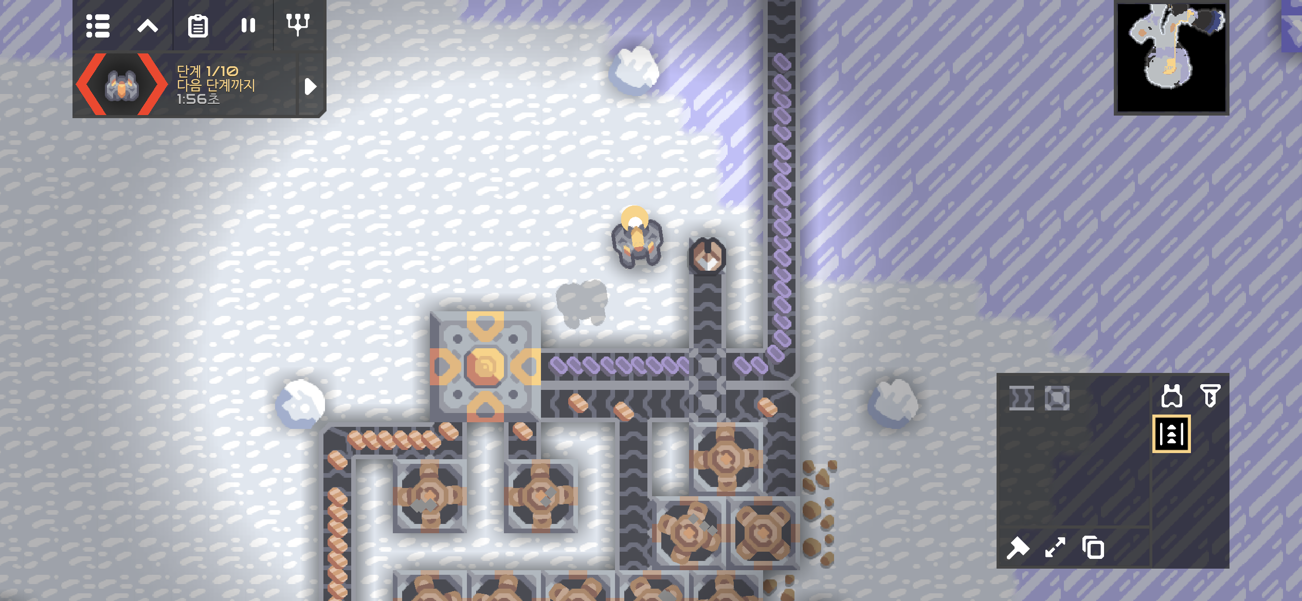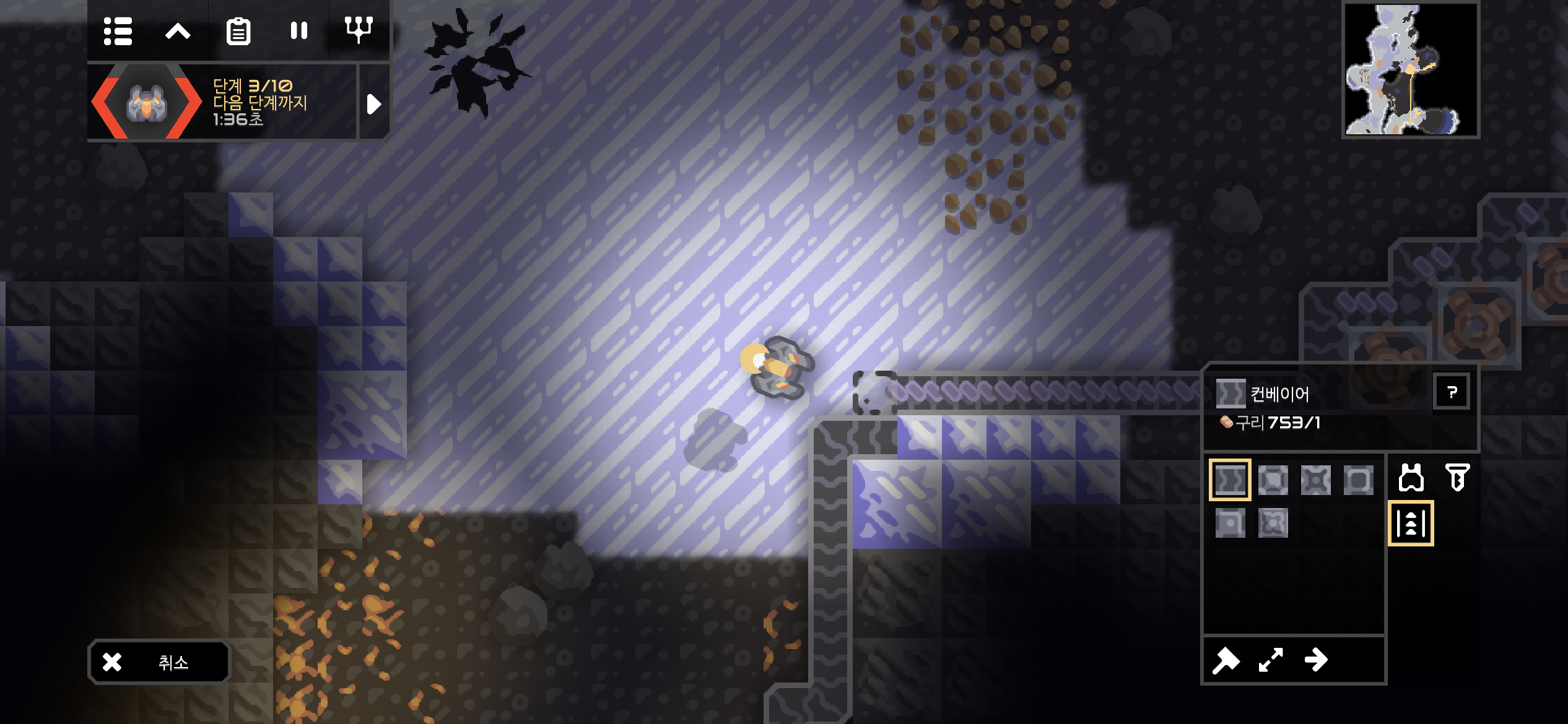 디펜스 라인의 구리가 가득차게 되어 기계식 드릴이 멈췄습니다. 이전에 연구했던 포화 필터를 이용해 가득찬 자원은 코어로 가도록 컨베이어를 연결합니다.