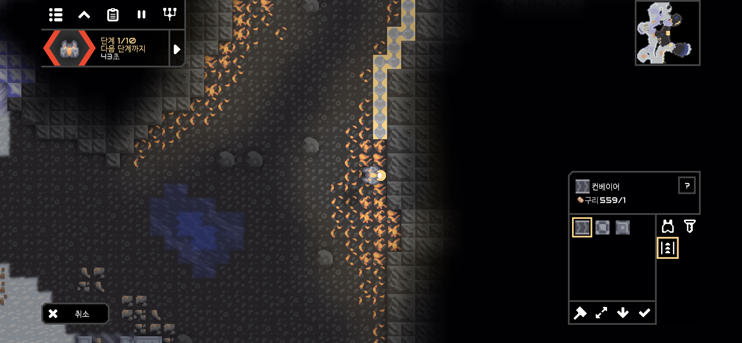 납이 이동할 컨베이어를 건설하는데 용암 지대가 보이네요. 아직은 용암을 활용할 방법이 없는듯 합니다.