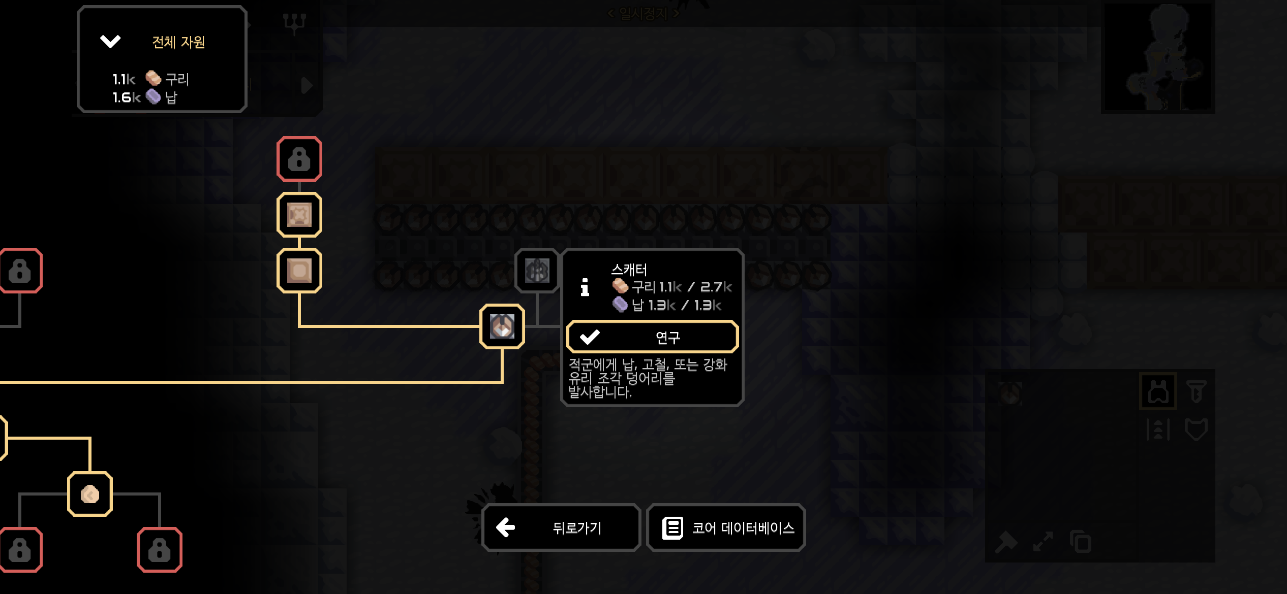 모은 자원으로 스캐터를 연구합니다. 상당히 많은 구리가 필요하네요.